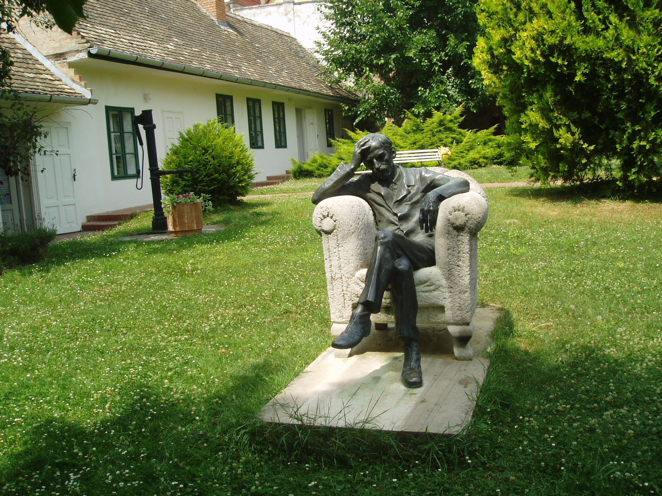 Nyilvános 1638 | 3655 | Szekszárd, Babits Mihály utca 13. Babits Mihály Emlékház | Babits Mihály egyemeletes, copf stílusú szülőháza a XIX. század elején (egyes források szerint 1780 körül) épült az akkor a város védőszentjéről Szt. Lászlónak nevezett utcában. A költő anyai nagyapja 1852-ben, szekszárdi letelepedésekor vásárolta meg. Itt született a költő 1883. november 26-án, s sokat tartózkodott és alkotott ezen a helyen. 1967-ben rendezték meg a házban az első emlékkiállítást, amelyet 1983-ban, a költő születésének centenáriumán újjáalakítottak, s az egész épületet emlékháznak rendezték be. A költő relikviái, a család bútorai, használati tárgyai és dokumentumai mellett láthatók Farkas Pál, Rippl-Rónai József, Glatz Oszkár és Beck Ö. Fülöp Babitsot ábrázoló képzőművészeti alkotásai is. Babits Mihály számos verse itt született, és itt játszódik a Halálfiai című regény több fejezete is. Az épület udvarán 1981-ben avatták fel Babits Mihály szobrát, Farkas Pál alkotását. A töprengő költő szobra a szülőház elválaszthatatlan része lett. Babits szülőházában állandó kiállítás idézi a szintén szekszárdi születésű Dienes Valéria filozófus és Baka István költő, író emlékét. A fénykép 2006 júliusában készült. Felh. irod.: www.szekszard.hu www.museum.hu Töttős Gábor: Babits bölcsői körül. = Tolna Megyei Levéltári Füzetek 6. Szekszárd, 1977 |