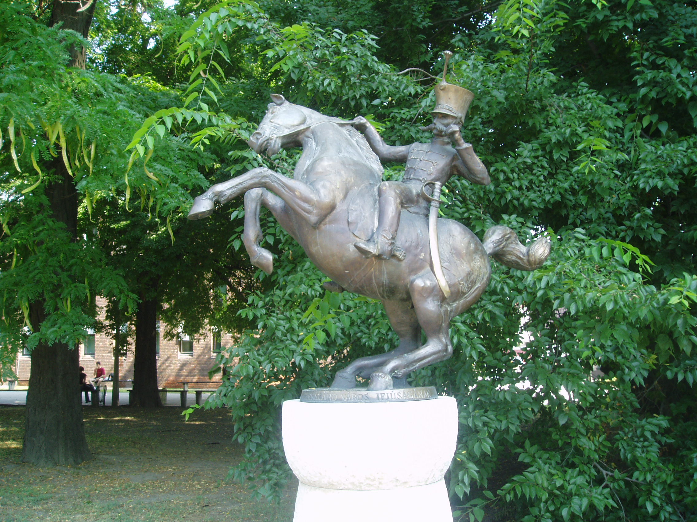 Nyilvános 1261 | 2766 | Szekszárd, Liszt Ferenc tér: Háry János szobra | A szekszárdi születésű (lásd: Szekszárd, Széchenyi u. 40.) Garay János, majd később Kodály Zoltán által halhatatlanná tett mesehős, Háry János szobra a Szekszárdon élő Farkas Pál alkotása. Felállítását dr. Joó Ferenc adománya tette lehetővé 1992-ben. A helyi hagyomány szerint a szobor háta mögötti Augusz-házban (lásd: Szekszárd, Széchenyi u. 36-38.) szolgált az az egykori katona, akiről Garay Háry János alakját mintázta. A fénykép 2006 júliusában készült. Felh. irod.: http://www.szeki.hu/turista/kalauz/magyar/tuka0201.htm Töttös Gábor: Szekszárd. Bp. Panoráma, 1986 Töttös Gábor: Irodalmi séták Szekszárdon. 1985 |