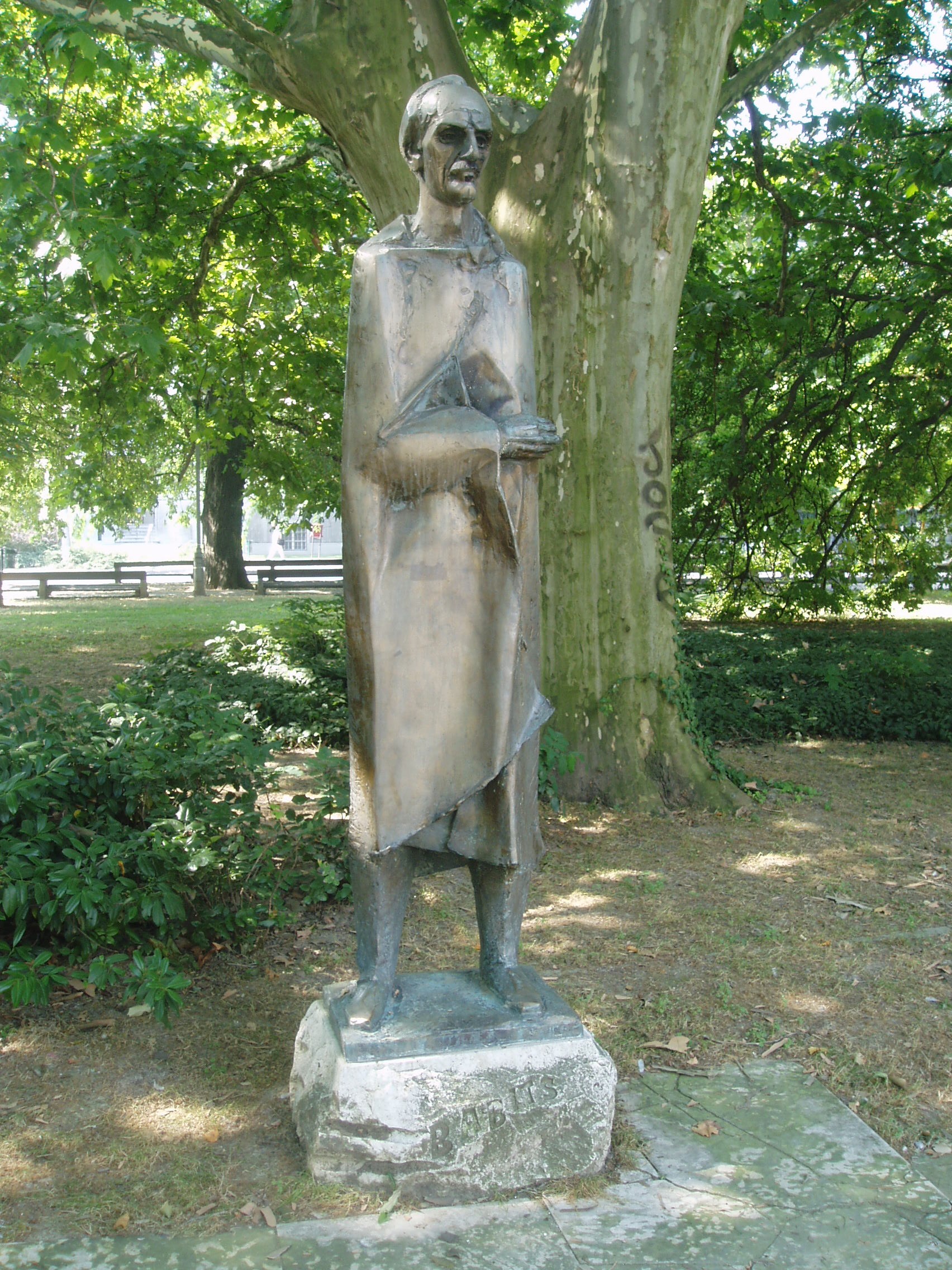 Nyilvános 1119 | 1855 | Szekszárd, Sétakert: Babits Mihály szobra | A szekszárdi születésű (lásd: Szekszárd, Babits M. u. 13.) Babits Mihály egészalakos szobrának alkotója Kis Kovács Gyula szobrászművész. A bronzszobrot 1971-ben állították fel a Babits nevét viselő művelődési ház melletti kis téren. Onnan helyezték át a mai helyére, a Sétakert platánjai alá. A fénykép 2006 júliusában készült. Felh. irod.: www.szekszard.hu |
