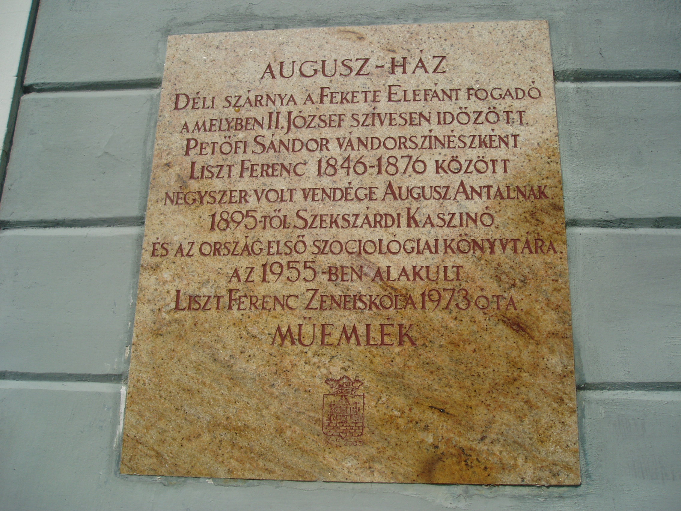 Nyilvános 1146 | 1782 | Szekszárd, Széchenyi utca 36-38. Augusz-ház | Az Augusz–család egykori kúriája, amelyben négy alkalommal vendégeskedett Liszt Ferenc, három eltérő korú épületrészből áll. Legrégebbi része a jelenleg kékesszürkére festett déli szárny. Id. Augusz Antal 1820 körül építtette, az ő fia volt Liszt barátja, a később bárói címet kapott Augusz Antal. Az épület három homokkő oszlopon nyugvó középső része az 1830-as évekből való. A trieszti Miramare–kastély által ihletett rózsaszínű, tornyos északi szárnnyal pedig az 1860-as években bővíttette otthonát az ekkor már bárói címmel felruházott Augusz Antal. Ezt az épületrészt a szekszárdi Stann Jakab tervezte. Ennek a szárnynak első emeletén voltak Liszt Ferenc kertre néző lakosztályának szobái. A helyi hagyomány szerint az idősebb Augusz idejében ebben házban szolgált az az egykori katona, akiről Garay János Háry János alakját mintázta. Liszt Ferenc négy alkalommal töltött rövidebb–hosszabb időt Szekszárdon ebben a házban Augusz Antal vendégeként (1846, 1865, 1870, 1876). Később az épületben működött a szekszárdi kaszinó, s ennek keretében az ország első közgazdasági és társadalomtudományi szakkönyvtára. 1973 óta a Liszt Ferenc Zeneiskola otthona. Az épület középső szárnyának városközpont felé eső homlokzatán 1931-ben leplezték le Liszt Ferenc portrédomborművel díszített emléktábláját, Wigand Edit alkotását. A verset Bodnár István, a kaszinó igazgatója írta. A fénykép 2006 júliusában készült. Felh. irod.: www.szeki.hu/turista/kalauz/magyar/tu000012.htm www.csatolna.hu/hu/tolnamegye Vendel–Mohay Lajosné: Liszt–emlékek Szekszárdon. Szekszárd, 1986 |