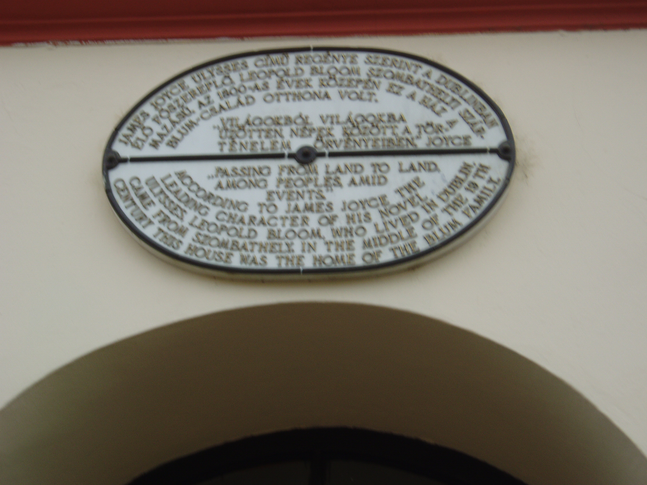 Nyilvános 1138 | 1807 | Szombathely, Fő tér 40. | 2004-ben ezen a helyen állították fel James Joyce író életnagyságú szobrát, Veres Gábor alkotását, amint a ház falából kilépve üdvözli az arra járót. Magyar és angol nyelvű felirat hívja fel a figyelmet, hogy Joyce híres regényének, az Ullyssesnek a hőse, Leopold Bloom (Virág Lipót) szombathelyi származásúnak mondja magát. A helytörténeti kutatások szerint az 1800-as évek közepén valóban élt Blum család Szombathelyen, akik annakidején ebben a házban laktak. Joyce talán trieszti tartózkodása idején kerülhetett valamelyikükkel kapcsolatba. A modern irodalom alapművének számító Ulysses, a kisember odüsszeiája június 16-án, egy nap alatt játszódik Dublinban. Az 1950-es évek óta a Joyce rajongók világszerte kortárs művészeti fesztiválokkal ünneplik ezt a napot (Bloomsday), amelynek már Szombathelyen is hagyománya van: az első magyar James Joyce Társaság is Szombathelyen alakult meg 2001-ben. A téma iránt érdeklődőnek érdemes elolvasni Najmányi László: A Blum ház rejtélye c. regényét (Golyós Toll Kft. – DIREKT kiadó, 2007). A fénykép 2006 májusában készült. Felh. irod.: www.bloomsday.hu A Bloomsday Szombathelyen. = www.litera.hu www.joyce.hu |