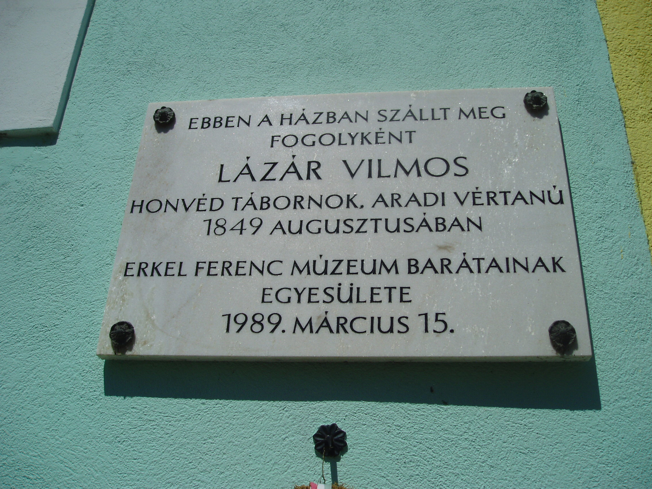 Nyilvános 1054 | 1626 | Gyula, Kossuth utca 18. | 1849 augusztusában ebben a lakóházban szállt meg fogolyként Lázár Vilmos honvéd ezredes, aradi vértanú. A szabadságharc tragikus gyulai eseményét lásd: Gyula, Várkert: Honvédtiszti emlékhely. A fénykép 2007 júliusában készült. Felh. irod.: Czeglédi Imre: Gyula útikalauz. 2. jav., bőv. kiad. Gyula, 1995 |