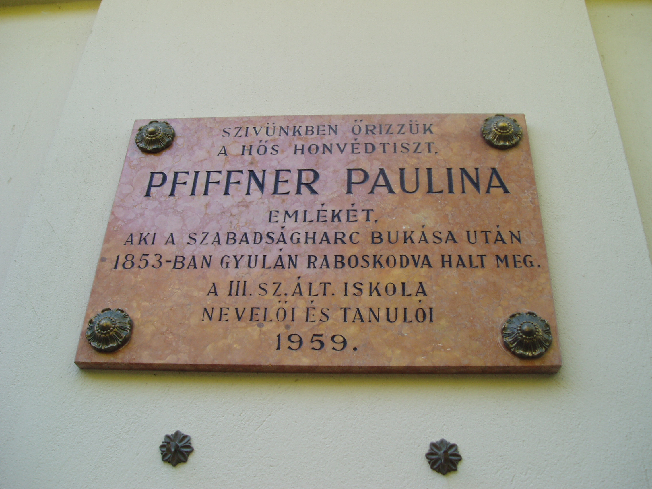 Nyilvános 1098 | 1572 | Gyula, Kossuth utca 36. | Az épületben az uradalmi kulcsár lakott, majd a szabadságharc bukása után itt helyezték el az új szervezésű csendőrséget. 1853-ban itt tartották őrizetben Pfiffner Paulinát (1825-1853), egy mezőhegyesi méneskari tiszt leányát, aki férfiruhában mint honvéd hadnagy végigharcolta a szabadságharcot. A "Hős honvédleány" egy óvatlan pillanatban ebben a házban lett öngyilkos: szeptember 1-jén fegyverhez jutott és meglőtte magát. Hetekkel később, szeptember 29-én hunyt el a gyulai kórházban. Testét az egyházi tilalom miatt a temető árkában földelték el, csak 1888-ban kapott méltó síremléket közadakozásból. A fénykép 2007 júliusában készült. Felh. irod.: Czeglédi Imre: Gyula útikalauz. 2. jav., bőv. kiad. Gyula, 1995 www.bekes-archiv.hu/dokumentumok/olvasokonyv |