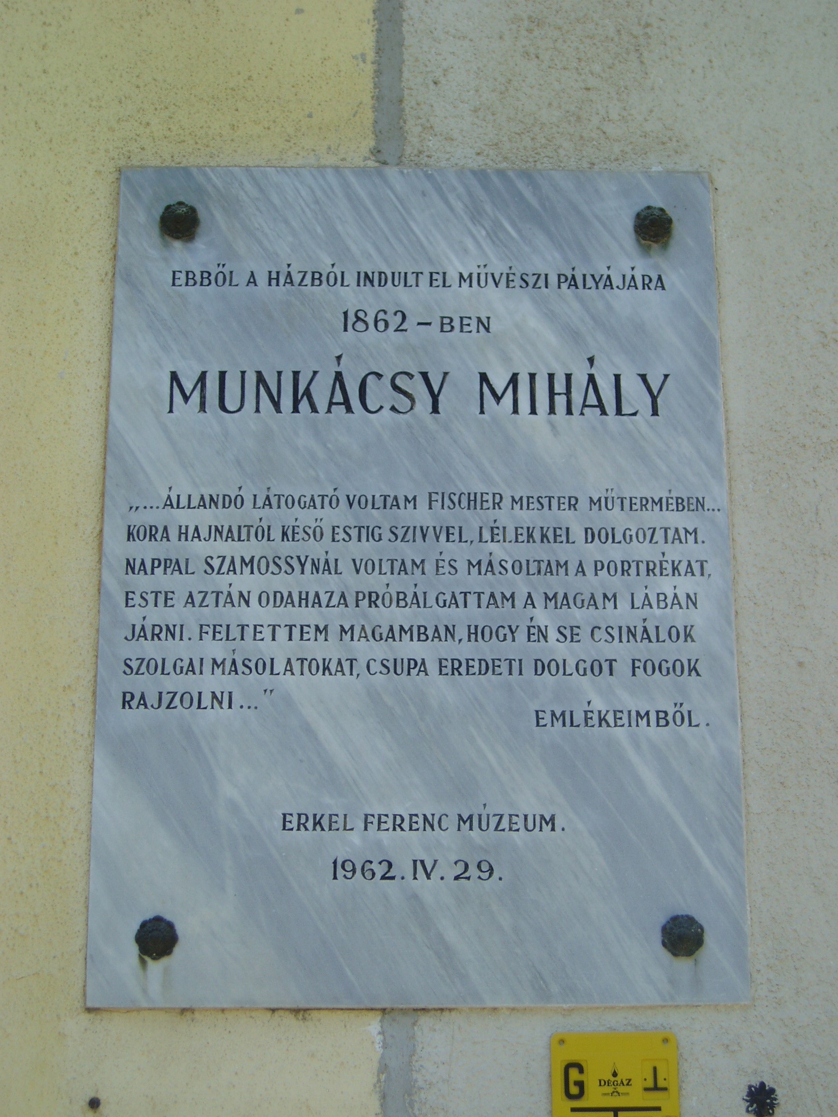Nyilvános 1080 | 1570 | Gyula, Munkácsy utca 15. | Ebben a földszintes házban - Oláh György asztalosmester egykori házában - lakott 1860-61-ben Reök István, Munkácsy Mihály nagybátyja és gyámja. A Bach-rendszer bukása után ugyanis mint régi negyvennyolcas a megyénél kapott állást, s Gyulára költözött (korábban Békéscsabán élt). Az Aradon asztaloslegényként dolgozó gyámfia, akkor még Lieb Mihály 1860 őszén őhozzá jött haza Gyulára. A sokáig váltólázban szenvedő fiút nagybátyja Karl Fischer helybeli rajztanár műtermében taníttatta, hogy az asztalosmesterséghez szükséges rajztudást elsajátítsa. S itt, Fischer mesternél látta meg őt a Wenckheim kastélyban (lásd: Gyula, Kossuth u. 15.) tartózkodó Szamossy Elek festőművész, aki felismerte Munkácsy tehetségét, magához vette, s Gyuláról távozván, a nagybácsi engedélyével magával is vitte. Így mentette meg a tehetséges fiút a magyar művészet számára. Munkácsy maga is azt vallja önéletírásában, hogy élete sorsa Gyulán dőlt el. A ház falán márványtábla őrzi Munkácsy emlékét, s ezen idézetet olvashatunk Munkácsy "Emlékeimből" című önéletrajzából. A fénykép 2007 júliusában készült. Felh. irod.: Czeglédi Imre: Gyula útikalauz. 2. jav., bőv. kiad. Gyula, 1995 |