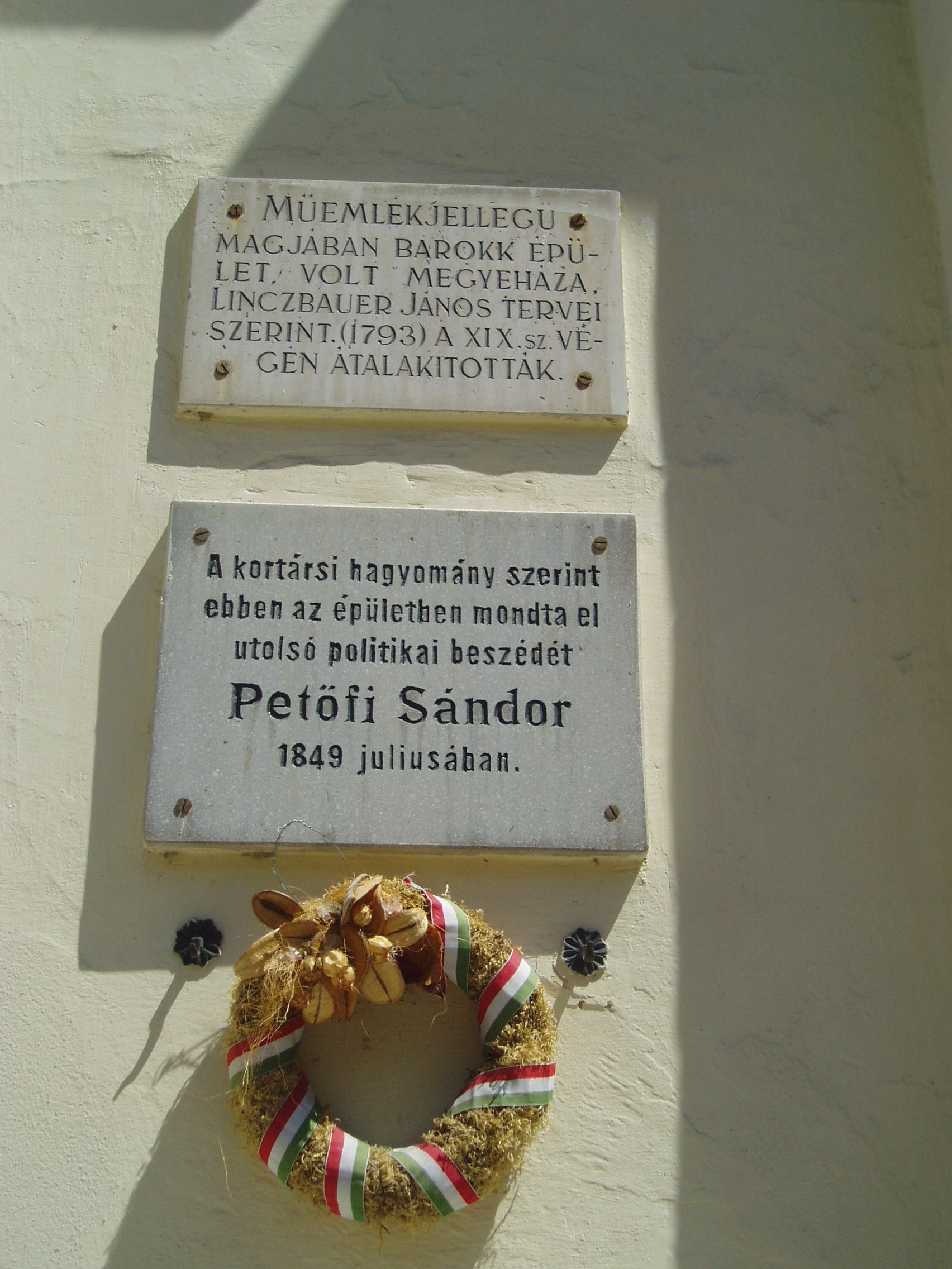 Nyilvános 1019 | 1475 | Gyula, Petőfi tér 3. Régi Vármegyeháza | A városközponti háromszög alakú hangulatos tér csaknem minden épülete történelmi vagy műemléki érték. Az egykori Vármegyeháza - a mai Városháza - a tér legszebb épülete. Eredeti formájában a XVIII. század utolsó harmadában épült az akkoriban újjátelepült Békés megye közigazgatási központjának. Azóta többszöri átépítéseket, alakításokat, bővítéseket hajtottak végre rajta. Ezek eredményeképpen ma barokk, klasszicista, romantikus és eklektikus részleteket egyaránt megfigyelhetünk az összességében eklektikus hatású épületen. A Vármegyeháza sok nevezetes eseménynek volt helyszíne. 1848. március 22-én az udvaron ismertették az egybegyűlt sokaság előtt a Pesten zajló eseményeket. A helyi hagyomány szerint 1849 júliusában a védbizottmány egyik ülésén mondta el utolsó politikai beszédét Petőfi Sándor. A költő akkoriban Mezőberényben tartózkodott, onnan rándult át a megyeszékhelyre. Az eseményt az épület homlokzatán emléktábla örökíti meg. A fénykép 2007 júliusában készült. Felh. irod.: Czeglédi Imre: Gyula útikalauz. 2. jav., bőv. kiad. Gyula, 1995 |