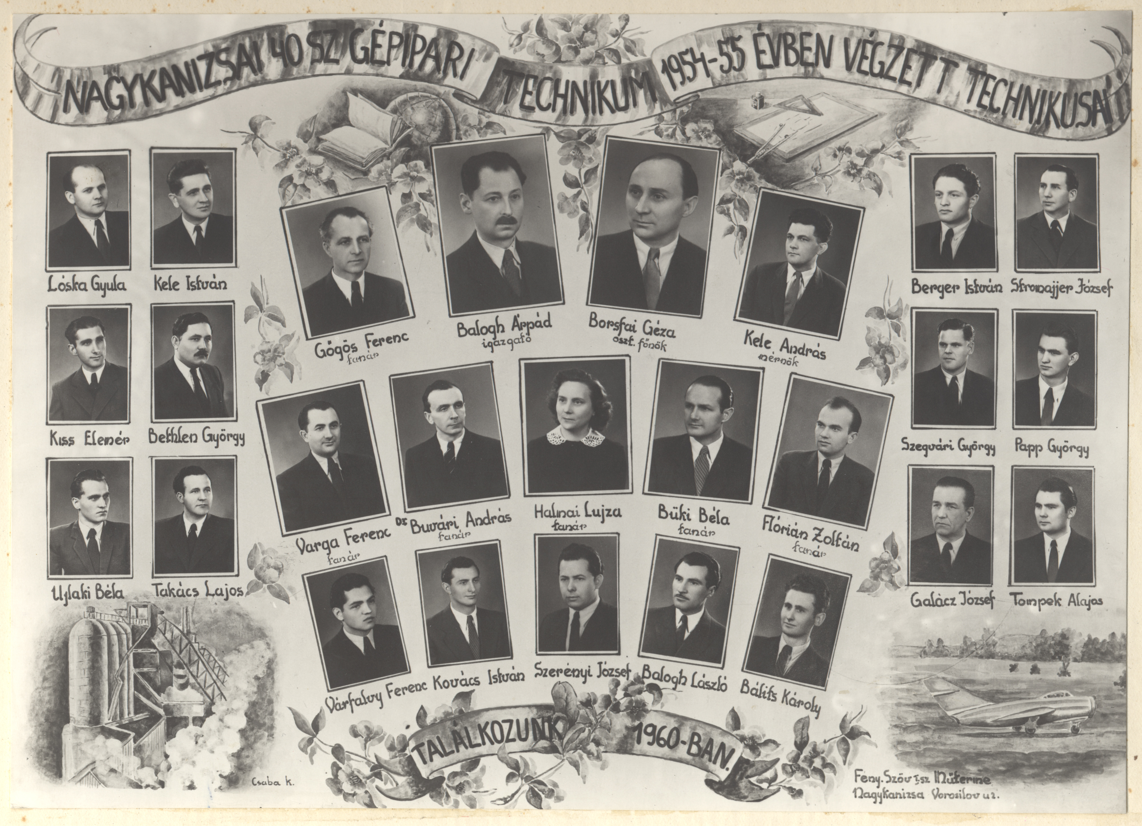 Nyilvános 1363 | 2464 | Nagykanizsai 40 sz Gépipari Technikum 1954-55 évben végzett technikusai | Balogh Árpád igazgató Borsfai Géza osztályfőnök Buvári András dr. tanár Büki Béla tanár Flórián Zoltán tanár Gőgös Ferenc tanár Halmai Lujza tanár Kele András mérnök Varga Ferenc tanár Bálits Károly Balogh László Berger István Bethlen György Galácz József Kele István Kiss Elemér Kovács István Lóska Gyula Papp György Stromajjer (?) József Szegvári György Szerényi József Takács Lajos Tompek Alajos Ujlaki Béla Várfalvy Ferenc |