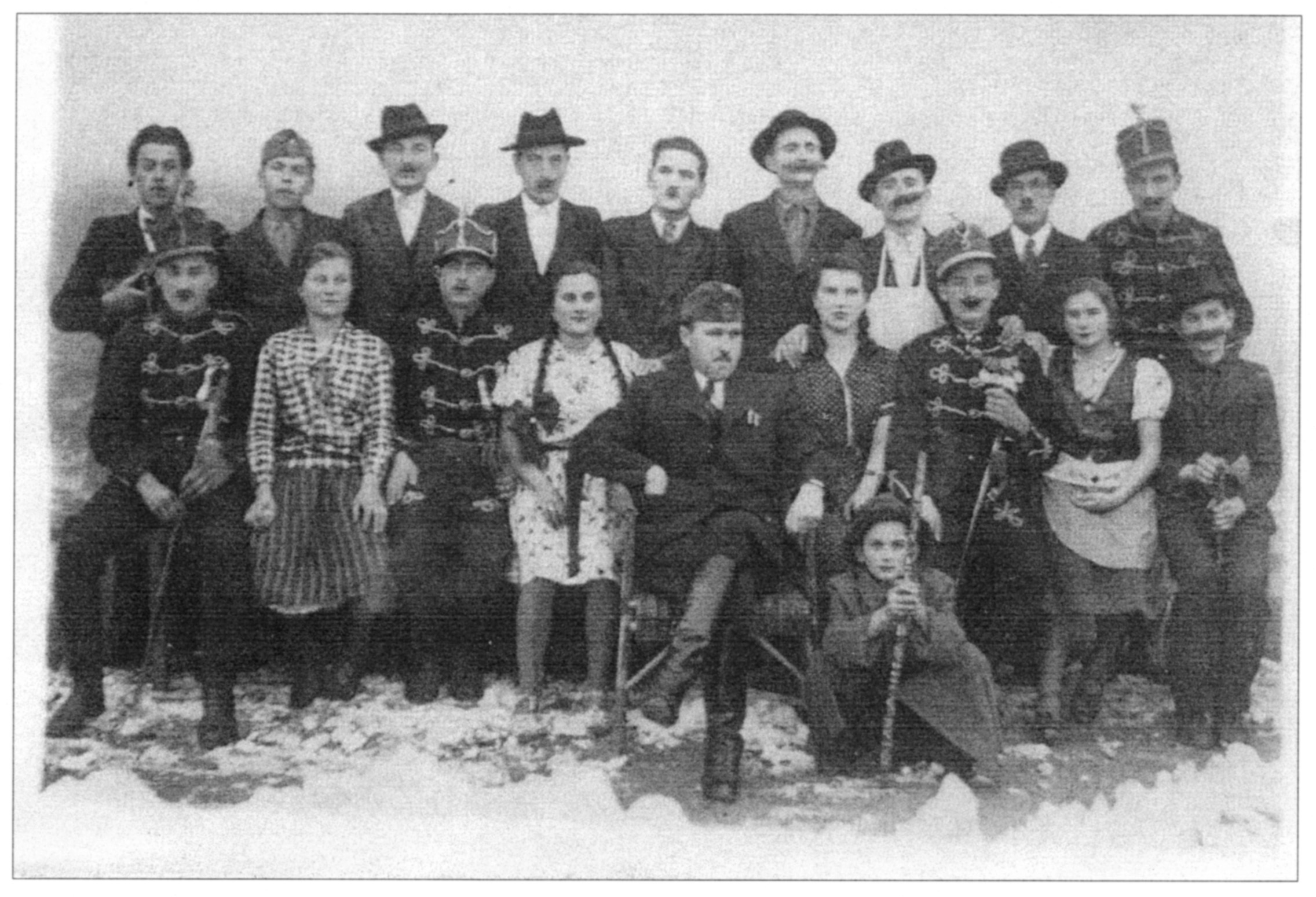 Nyilvános 1917 | 5323 | Rövid leírás | Teljes leírás (365 B) | "A vén bakancsos... társulata" Felső sor, balról: Horváth Rudolf, Révész István, Fleck József, Somogyi György, Pálmai László, Varga Lajos, Vajdai Károly, Dara József Alsó sor: Skoda Ferenc, Gyergyák Margit, Pusztai László, Gyergyák Anna, Vértes Imre, Vajdai Erzsébet, Somogyi Péter, Bedi Anna (Hajnalka), Sali László |