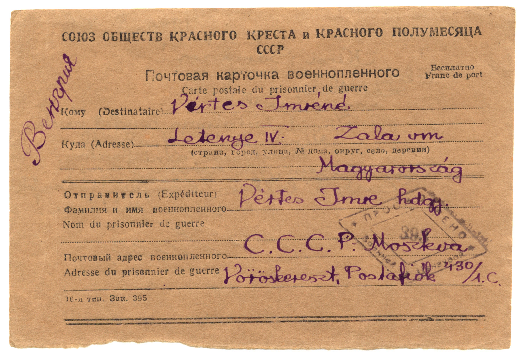 Nyilvános 1444 | 2488 | Vértes Imréné | Letenye IV. Zala vm. Magyarország Vértes Imre hdgy. C.C.C.P. Moszkva Vöröskereszt, Postafiók 430/1. c. 1946.X.20. Kicsi Sárikám! Élek, szeretlek, nagyon szeretlek. Rövid, tartalmas levelet várok. Mindenkiről írj, aki él. Mindenről, ami fontos. Egészségem, jó sorom van. Csak a lelkem szomjas utánatok. Viszontlátásra! Imre |