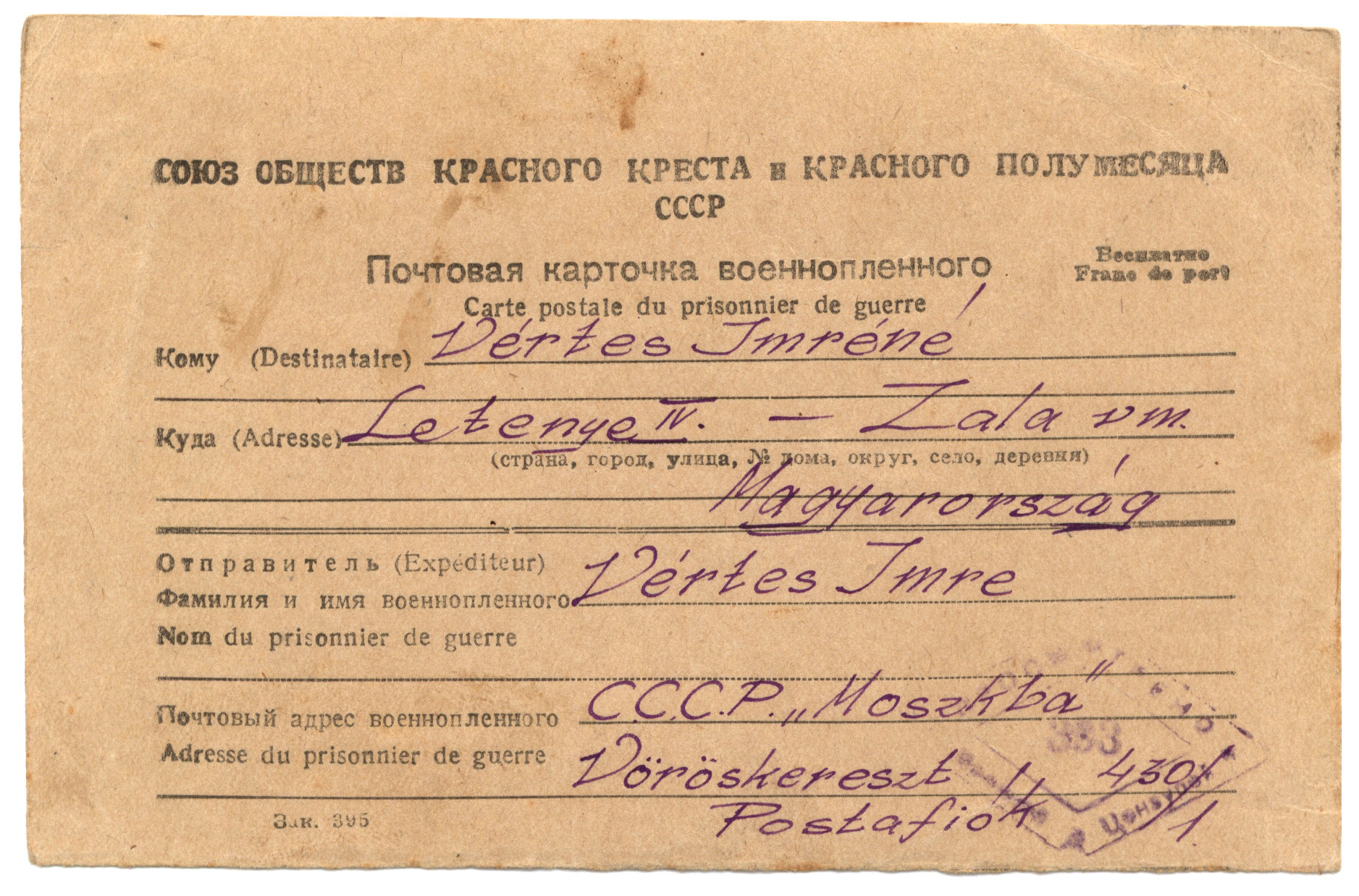 Nyilvános 1355 | 2263 | Vértes Imréné | Letenye IV. - Zala vm. Magyarország Vértes Imre hdgy. C.C.C.P. "Moszkva" Vöröskereszt, Postafiók 430/1. c. 10. IV. hó 1947. (Kaptam V. 12-én) Kedveseim! Húsvét volt, ünnep. Hogy gondoltam Rátok? Így! Volt nékem kis váram, mesekinccsel ékes, Szerelemmel, szívvel, széppel, jóval fényes. Aranyasszony ajka, gyermekkacaj hangja Csilingelt a szívben boldogság harangja. Mit éreztem? Amit Te szoktál érezni-, Sárikám - mikor a négy alvó kisgyerek fölött imát dalol a szíved. Nagy, tiszta, szép vágyat! A szép élet utáni vágyat. Apuka |