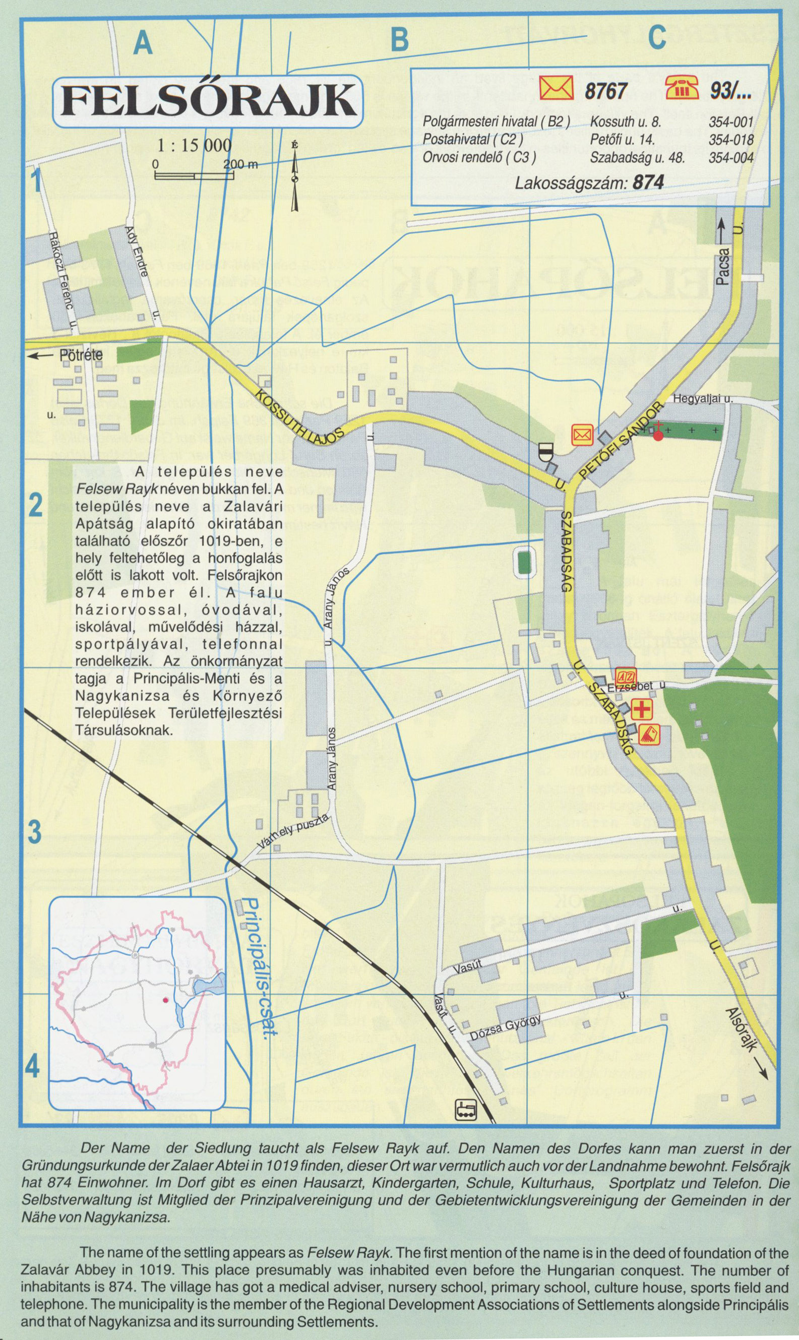 Nyilvános 2328 | 7762 | Felsőrajk | A település neveFelsew Rayknéven bukkan fel. A település neve a Zalavári Apátság alapító okiratában található először 1019-ben, e hely feltehetőleg a honfoglalás előtt is lakott volt. Felsőrajkon 874 ember él. A falu háziorvossal, óvodával, iskolával, művelődési házzal, sportpályával, telefonnal.rendelkezik. Az önkormányzat tagja a Principális-Menti és a Nagykanizsa és Környező Települések Területfejlesztési Társulásoknak. Der Name der Siedlung taucht als Felsew Rayk auf. Den Namen des Dorfes kann man zuerst in der Gründungsurkunde der Zalaer Abtei in 1019 finden, dieser Ort war vermutlich auch vor der Landnahme bewohnt. Felsőrajk hat 874 Einwohner. Im Dorf gibt es einen Hausarzt, Kindergarten, Schule, Kulturhaus, Sportplatz und Telefon. Die Selbstverwaltung ist Mitglied der Prinzipalvereinigung und der Gebietentwicklungsvereinigung der Gemeinden in der Nähe von Nagykanizsa. The name of the settling appears as Felsew Rayk. The first mention of the name is in the deed of foundation of the Zalavár Abbey in 1019. This place presumably was inhabited even before the Hungarian conquest. The number of inhabitants is 874. The village has got a medical adviser, nursery school, primary school, culture house, sports field and telephone. The municipality is the member of the Regional Development Associations of Settlements alongside Principális and that of Nagykanizsa and its surrounding Settlements. A részlet a következő kiadványból származik/Die Teile stammen vom volgenden Buch/This text came from the following book: Cím/Titel/Title: Zala megye településeinek atlasza - 257 település részletes térképe/Atlas der Komitat Zala - 257 Detailte Siedlungskarten/Zala county\'s Atlas - 257 settlement maps. Közreműködő/contributor: Lackner László (1943) (fotó) Kiadás/Ausgabe/Publisher: Gyula : HISZI-MAP, 1997 Sorozat/Serie/Series: Indulástól - megérkezésig... ETO: 912(439.121-2) ; 908.439.121 Cutter: Z 19 ISBN: 963-610-025-4 Oldalszám/Seiten/Pages: 323, 81 p. Megjegyzés/Note: Lezárva/Abgeschlossen am/Closed am: 1997. máj. 30. |