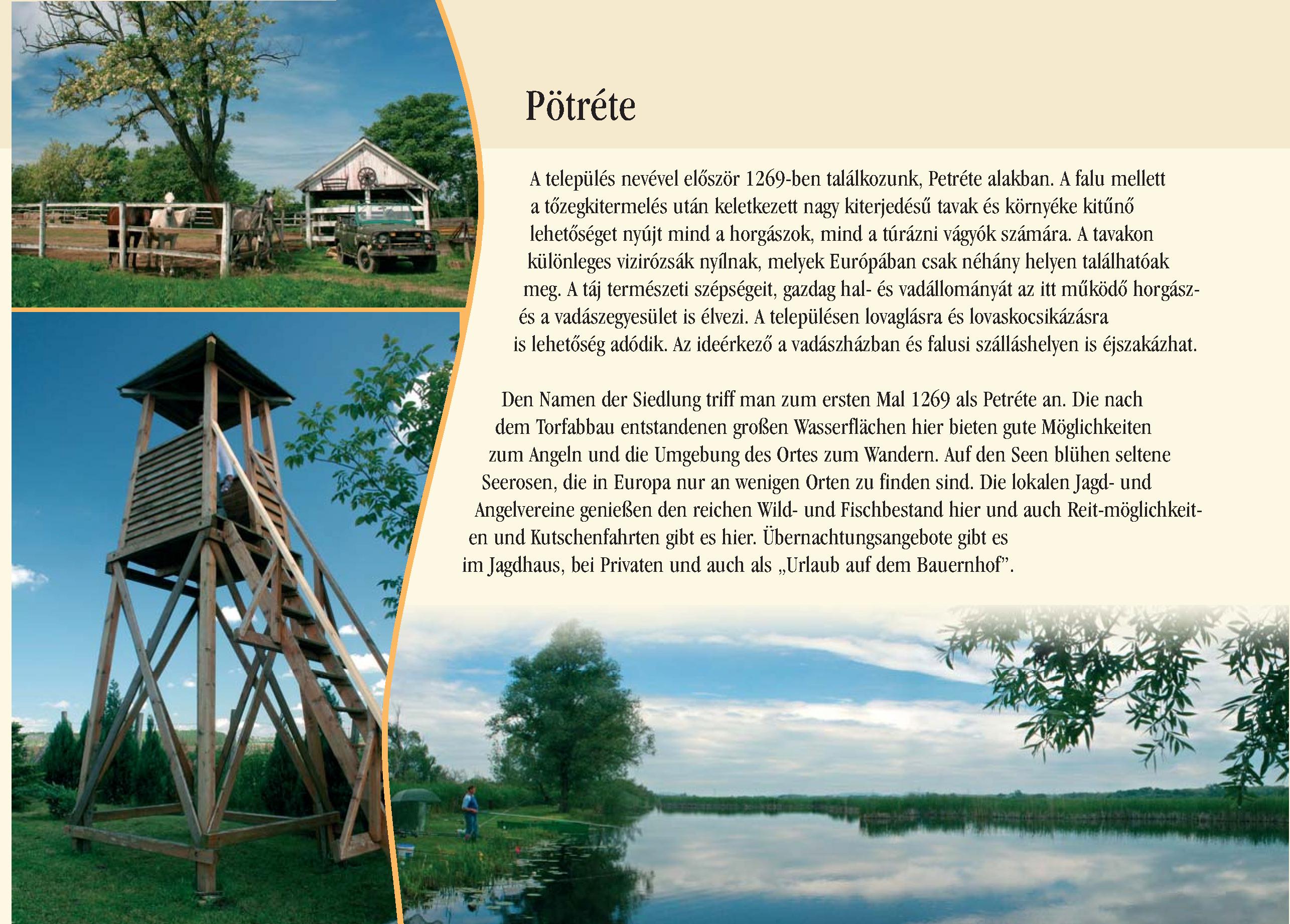 Nyilvános 2377 | 6265 | Pötréte | Den Namen der Siedlung triff man zum ersten Mal 1269 als Petréte an. Die nach dem Torfabbau entstandenen großen Wasserflächen hier bieten gute Möglichkeiten zum Angeln und die Umgebung des Ortes zum Wandern. Auf den Seen blühen seltene Seerosen, die in Europa nur an wenigen Orten zu finden sind. Die lokalen Jagd- und Angelvereine genießen den reichen Wild- und Fischbestand hier und auch Reit-möglichkeiten und Kutschenfahrten gibt es hier. Übernachtungsangebote gibt es im Jagdhaus, bei Privaten und auch als ,,Urlaub auf dem Bauernhof". Dieses Text stammt von: Pannonhát tájpark prospektus 2006. Web: http://www.pannonhat.hu/ (auch in Deutsch |