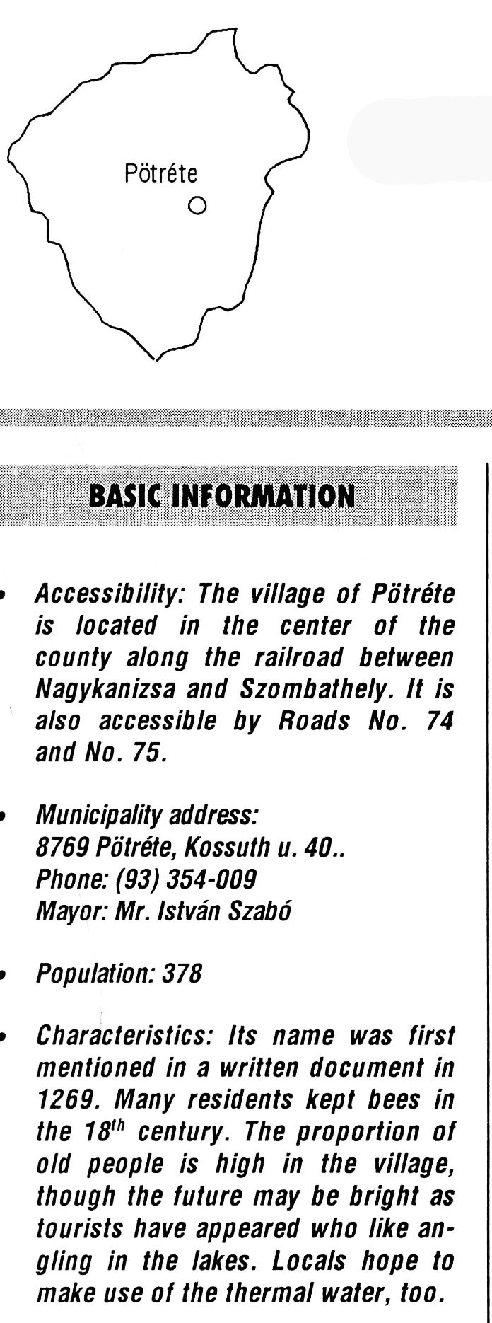 Nyilvános 2352 | 5877 | Pötréte | BASIC INFORMATION Accessibility: The village of Pötréte is located in the center of the county along the railroad between Nagykanizsa and Szombathely. It is also accessible by Roads No. 74 and No. 75. Municipality address: 8769 Pötréte, Kossuth u. 40. Phone: (93) 354-009 Mayor: Mr. István Szabó Population: 378 Characteristics: Its name was first mentioned in a written document in 1269. Many residents kept bees in the 18th century. The proportion of old people is high in the village, though the future may be bright as tourists have appeared who like angling in the lakes. Locals hope to make use of the thermal water, too. This text came from the following book: Title: Handbook of Zala county (Zala megye kézikönyve) Series: County handbooks of Hungary (Magyarország megyei kézikönyvei) Chief editor: Hóbor József Publisher: (Hatvan), CEBA-Hungary Ltd, 1998 ETO: 908.439.121(035) ; 050.8(439.121) ISBN: 963-9089-18-2 Pages: 488-1040 p. Remark: Closed on: 1998. márc. 31. |