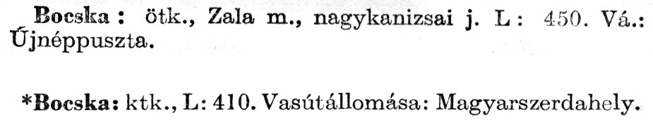 Nyilvános 2330 | 5904 | A szócikkek felismertetett szövege: | (A csillag után az 1972-es kiadású kiegészítő kötetből származó szöveg következik) Bocska: ötk., Zala m., nagykanizsai j. L : 450. Vá.: Újnéppuszta. *Bocska: ktk., L: 410. Vasútállomása: Magyarszerdahely. A szócikkek a következő lexikonból származnak: Cím: Új magyar lexikon Közreműködő: Berei Andor (1900-1979) (szerk.) Szerz. közl.: [szerk. Berei Andor et al.] Kiadás jelzés: 2. lny. Kiadás: Budapest : Akad. K., 1961-1962 Kötetei: 1., A - C 2., D - F 3., G - J 4., K - Me 5., Mf - R 6., S - Z 7. köt., A-Z Kiegészítő kötet (1972) Kiegészítő kötet, 1962÷1980 (1981) ETO jelzet: 03=945.11 Szakjelzet: 030 Cutter: U 28 Nyelv: magyar Megjegyzés: Bibliogr. a címszavak egy részének végén |