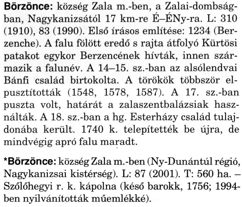 Nyilvános 2326 | 6095 | Rövid leírás | Teljes leírás (2.48 KB) | A szócikkek felismertetett szövege: (A csillag után a kiegészítő kötetből származó szöveg következik) Börzönce: község Zala m.-ben, a Zalai-dombságban, Nagykanizsától 17 km-re É-ÉNy-ra. L: 310 (1910), 83 (1990). Első írásos említése: 1234 (Ber-zenche). A falu fölött eredő s rajta átfolyó Kürtösi patakot egykor Berzencének hívták, innen származik a falunév. A 14-15. sz.-ban az alsólendvai Bánfi család birtokolta. A törökök többször elpusztították (1548, 1578, 1587). A 17. sz.-ban puszta volt, határát a zalaszentbalázsiak használták. A 18. sz.-ban a hg. Esterházy család tulajdonába került. 1740 k. telepítették be újra, de mindvégig apró falu maradt. *Börzönce: község Zala m.-ben (Ny-Dunántúl régió, Nagykanizsai kistérség). L: 87 (2001). T: 560 ha. -Szőlőhegyi r. k. kápolna (késő barokk, 1756; 1994-ben nyilvánították műemlékké). A szócikkek a következő lexikonból származnak: Cím: Magyar nagylexikon Közreműködő: Élesztős László (1949) (szerk.) ; Barabás Éva (1943) (szerk.) ; Berényi Gábor (1946) (szerk.) ; Bárány Lászlóné (szerk.) ; Adelmann-né Kertész Judit (1945) (közrem.) ; Froemel Károlyné Jáky Éva (1936) (közrem.) ; Akadémiai Kiadó és Nyomda Vállala Szerz. közl.: [... Élesztős László főszerk.] ; [szerk. Barabás Éva et al.] ; [bibliogr. Adelmanné Kertész Judit] ; [kész. az Akadémiai Kiadó Magyar Nagylexikon Szerkesztőségében] Kiadás: Budapest : Akad. K., 1993- Kötetei: 1. köt., A - Anc 2. köt., And - Bag 3. köt., Bah - Bij 4. köt., Bik - Bz 5. köt., C - Csem 6. köt., Csen - Ec 7. köt., Ed - Fe 8. köt., Ff - Gyep 9. köt., Gyer - Iq 10. köt., Ir - Kip 11. köt., Kir - Lem 12. köt., Len - Mep 13. köt., Mer - Nyk 14. köt., Nyl - Pom 15. köt., Pon - Sek 16. köt., Sel - Szö 17. köt., Szp - Ung 18. köt., Unh - Z 19. köt., Kiegészítő kötet, A - Z ETO jelzet: 030=945.11 Szakjelzet: 030 Cutter: M 14 ISBN: 963-05-6611-7 [!ISBN 963-05-6615-X] Nyelv: magyar Megjegyzés: Az 5. kötettől kiad. a Magyar Nagylexikon Kiadó ; A 6. kötettől főszerk. Berényi Gábor ; A 6. kötettől szakszerk. Bárány Lászlóné et al. ; A 6. kötettől bibliogr. Froemel Károlyné ; Bibliogr. a szócikkek végén |
