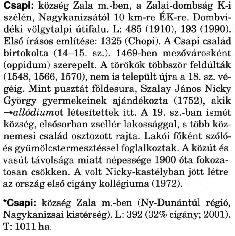 Nyilvános 2351 | 6446 | A szócikkek felismertetett szövege: | (A csillag után a kiegészítő kötetből származó szöveg következik) Csapi: község Zala m.-ben, a Zalai-dombság K-i szélén, Nagykanizsától 10 km-re ÉK-re. Dombvidéki völgytalpi útifalu. L: 485 (1910), 193 (1990). Első írásos említése: 1325 (Chopi). A Csapi család birtokolta (14-15. sz.). 1469-ben mezővárosként (oppidum) szerepelt. A törökök többször feldúlták (1548, 1566, 1570), nem is települt újra a 18. sz. végéig. Mint pusztát földesura, Szalay János Nicky György gyermekeinek ajándékozta (1752), akik → allódiumot létesítettek itt. A 19. sz.-ban ismét község, elsősorban zsellér lakossággal, s több köznemesi család osztozott rajta. Lakói főként szőlő-és gyümölcstermesztéssel foglalkoztak. A közút és vasút távolsága miatt népessége 1900 óta fokozatosan csökken. A volt Nicky-kastélyban jött létre az ország első cigány kollégiuma (1972). *Csapi: község Zala m.-ben (Ny-Dunántúl régió, Nagykanizsai kistérség). L: 392 (32% cigány; 2001). T: 1011 ha. A szócikkek a következő lexikonból származnak: Cím: Magyar nagylexikon Közreműködő: Élesztős László (1949) (szerk.) ; Barabás Éva (1943) (szerk.) ; Berényi Gábor (1946) (szerk.) ; Bárány Lászlóné (szerk.) ; Adelmann-né Kertész Judit (1945) (közrem.) ; Froemel Károlyné Jáky Éva (1936) (közrem.) ; Akadémiai Kiadó és Nyomda Vállala Szerz. közl.: [... Élesztős László főszerk.] ; [szerk. Barabás Éva et al.] ; [bibliogr. Adelmanné Kertész Judit] ; [kész. az Akadémiai Kiadó Magyar Nagylexikon Szerkesztőségében] Kiadás: Budapest : Akad. K., 1993- Kötetei: 1. köt., A - Anc 2. köt., And - Bag 3. köt., Bah - Bij 4. köt., Bik - Bz 5. köt., C - Csem 6. köt., Csen - Ec 7. köt., Ed - Fe 8. köt., Ff - Gyep 9. köt., Gyer - Iq 10. köt., Ir - Kip 11. köt., Kir - Lem 12. köt., Len - Mep 13. köt., Mer - Nyk 14. köt., Nyl - Pom 15. köt., Pon - Sek 16. köt., Sel - Szö 17. köt., Szp - Ung 18. köt., Unh - Z 19. köt., Kiegészítő kötet, A - Z ETO jelzet: 030=945.11 Szakjelzet: 030 Cutter: M 14 ISBN: 963-05-6611-7 [!ISBN 963-05-6615-X] Nyelv: magyar Megjegyzés: Az 5. kötettől kiad. a Magyar Nagylexikon Kiadó ; A 6. kötettől főszerk. Berényi Gábor ; A 6. kötettől szakszerk. Bárány Lászlóné et al. ; A 6. kötettől bibliogr. Froemel Károlyné ; Bibliogr. a szócikkek végén |