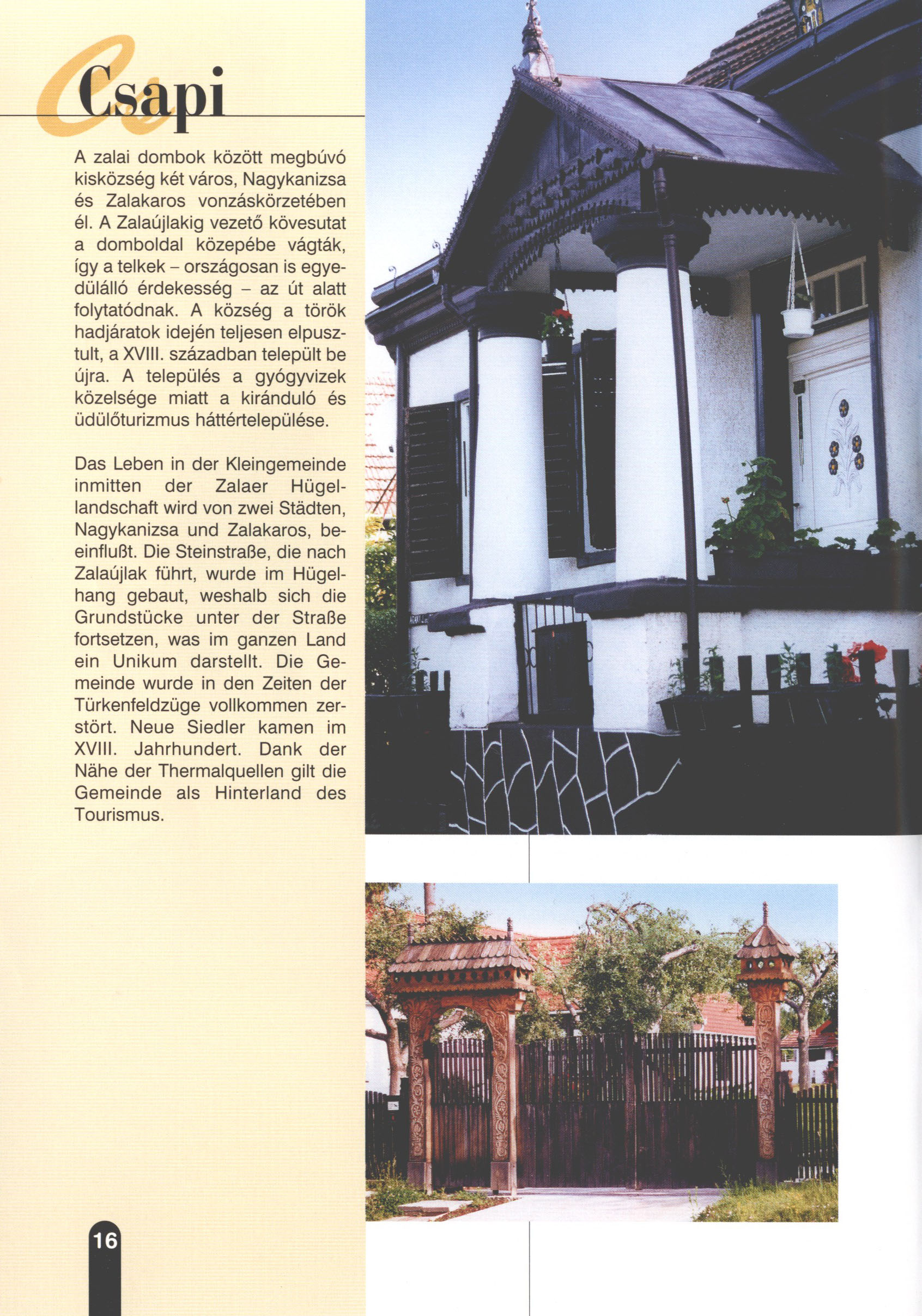 Nyilvános 2315 | 6547 | Csapi | Das Leben in der Kleingemeinde inmitten der Zalaer Hügellandschaft wird von zwei Städten, Nagykanizsa und Zalakaros, beeinflußt. Die Steinstraße, die nach Zalaújlak führt, wurde im Hügelhang gebaut, weshalb sich die Grundstücke unter der Straße fortsetzen, was im ganzen Land ein Unikum darstellt. Die Gemeinde wurde in den Zeiten der Türkenfeldzüge vollkommen zerstört. Neue Siedler kamen im XVIII. Jahrhundert. Dank der Nähe der Thermalquellen gilt die Gemeinde als Hinterland des Tourismus. Dieses Text stammt von: Titel: Hívogató a Régiók Kapujában - Útikönyv Látnivalók Nagykanizsán és Térségében (Einladend in dem Tor des Gebiets - Reisebuch - Sehenswürdigkeiten in Nagykanizsa und Umgebung) Herausgegeben von: Nagykanizsa és a Környező Települések Területfejlesztési Társulása (Verein für Gebietsentwicklung in Nagykanizsa und in ihrer Umgebung) 8800 Nagykanizsa, Petőfi Sándor út 5. Tel.: 06 93/536-453 • 06 93/536-454 Tel ./Fax: 06 93/326-323 E-mail: terstars@axelero.hu www.kanizsaterseg.celodin.hu |