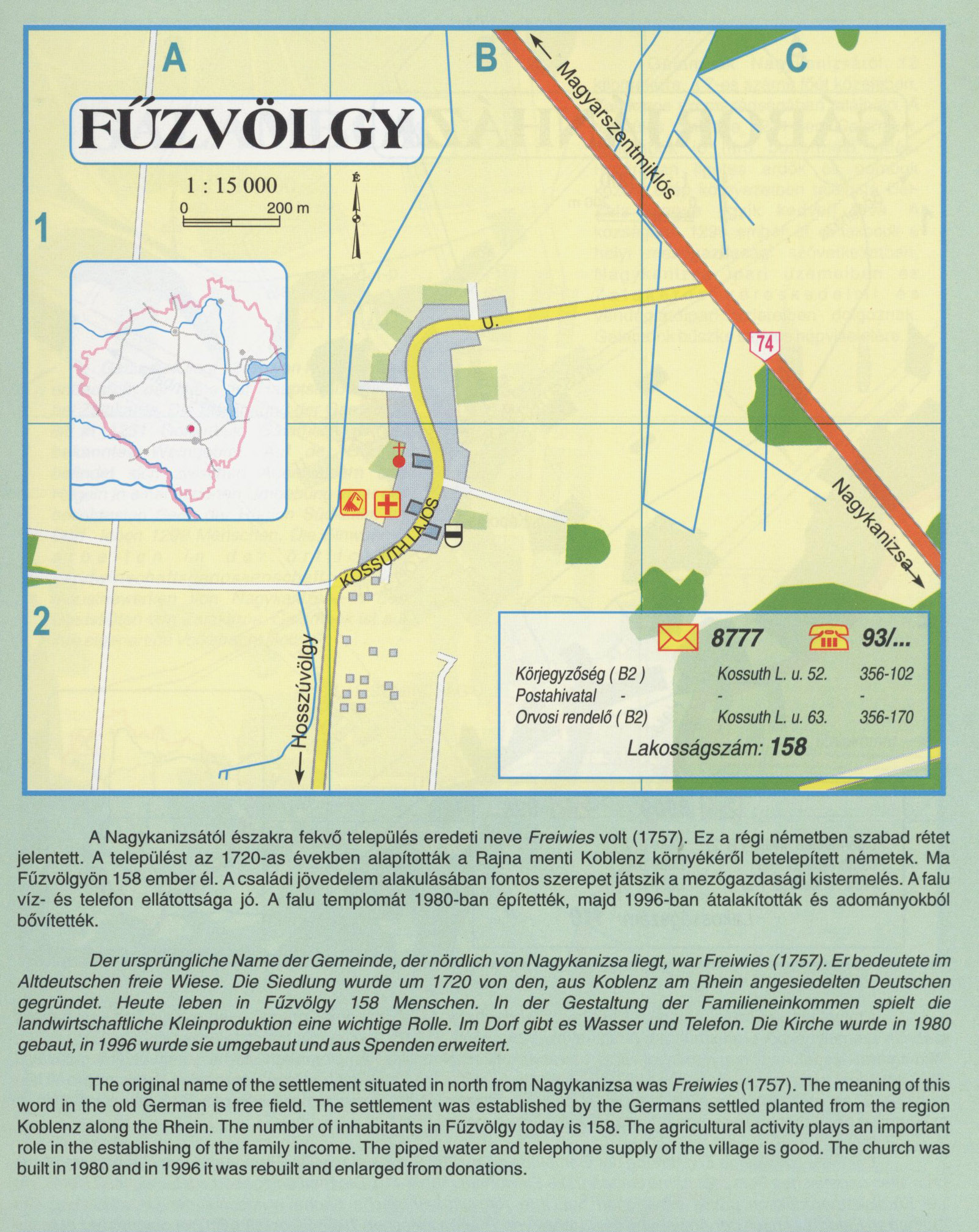 Nyilvános 2367 | 9442 | Fűzvölgy | A Nagykanizsától északra fekvő település eredeti neve Freiwies \\io\\\\ (1757). Ez a régi németben szabad rétet jelentett. A települést az 1720-as években alapították a Rajna menti Koblenz környékéről betelepített németek. Ma Fűzvölgyön 158 ember él. A családi jövedelem alakulásában fontos szerepet játszik a mezőgazdasági kistermelés. A falu víz- és telefon ellátottsága jó. A falu templomát 1980-ban építették, majd 1996-ban átalakították és adományokból bővítették. Der ursprüngliche Name der Gemeinde, der nördlich von Nagykanizsa liegt, war Freiwies (1757). Erbedeutete im Altdeutschen freie Wiese. Die Siedlung wurde um 1720 von den, aus Koblenz am Rhein angesiedelten Deutschen gegründet. Heute leben in Fűzvölgy 158 Menschen. In der Gestaltung der Familieneinkommen spielt die landwirtschaftliche Kleinproduktion eine wichtige Rolle. Im Dorf gibt es Wasser und Telefon. Die Kirche wurde in 1980 gebaut, in 1996 wurde sie umgebaut und aus Spenden erweitert. The original name of the settlement situated in north from Nagykanizsa was Freiwies (1757). The meaning of this word in the old German is free field. The settlement was established by the Germans settled planted from the region Koblenz along the Rhein. The number of inhabitants in Fűzvölgy today is 158. The agricultural activity plays an important role in the establishing of the family income. The piped water and telephone supply of the village is good. The church was built in 1980 and in 1996 it was rebuilt and enlarged from donations A részlet a következő kiadványból származik/Die Teile stammen vom volgenden Buch/This text came from the following book: Cím/Titel/Title: Zala megye településeinek atlasza - 257 település részletes térképe/Atlas der Komitat Zala - 257 Detailte Siedlungskarten/Zala county\'s Atlas - 257 settlement maps. Közreműködő/contributor: Lackner László (1943) (fotó) Kiadás/Ausgabe/Publisher: Gyula : HISZI-MAP, 1997 Sorozat/Serie/Series: Indulástól - megérkezésig... ETO: 912(439.121-2) ; 908.439.121 Cutter: Z 19 ISBN: 963-610-025-4 Oldalszám/Seiten/Pages: 323, 81 p. Megjegyzés/Note: Lezárva/Abgeschlossen am/Closed am: 1997. máj. 30. |