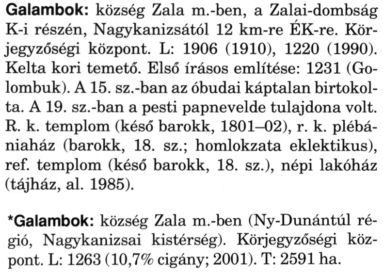 Nyilvános 2195 | 4578 | A szócikkek felismertetett szövege: | (A csillag után a kiegészítő kötetből származó szöveg következik) Galambok: község Zala m.-ben, a Zalai-dombság K-i részén, Nagykanizsától 12 km-re ÉK-re. Körjegyzőségi központ. L: 1906 (1910), 1220 (1990). Kelta kori temető. Első írásos említése: 1231 (Go-lombuk). A 15. sz.-ban az óbudai káptalan birtokolta. A 19. sz.-ban a pesti papnevelde tulajdona volt. R. k. templom (késő barokk, 1801-02), r. k. plébániaház (barokk, 18. sz.; homlokzata eklektikus), ref. templom (késő barokk, 18. sz.), népi lakóház (tájház, al. 1985). *Galambok: község Zala m.-ben (Ny-Dunántúl régió, Nagykanizsai kistérség). Körjegyzőségi központ. L: 1263 (10,7% cigány; 2001). T: 2591 ha. A szócikkek a következő lexikonból származnak: Cím: Magyar nagylexikon Közreműködő: Élesztős László (1949) (szerk.) ; Barabás Éva (1943) (szerk.) ; Berényi Gábor (1946) (szerk.) ; Bárány Lászlóné (szerk.) ; Adelmann-né Kertész Judit (1945) (közrem.) ; Froemel Károlyné Jáky Éva (1936) (közrem.) ; Akadémiai Kiadó és Nyomda Vállala Szerz. közl.: [... Élesztős László főszerk.] ; [szerk. Barabás Éva et al.] ; [bibliogr. Adelmanné Kertész Judit] ; [kész. az Akadémiai Kiadó Magyar Nagylexikon Szerkesztőségében] Kiadás: Budapest : Akad. K., 1993- Kötetei: 1. köt., A - Anc 2. köt., And - Bag 3. köt., Bah - Bij 4. köt., Bik - Bz 5. köt., C - Csem 6. köt., Csen - Ec 7. köt., Ed - Fe 8. köt., Ff - Gyep 9. köt., Gyer - Iq 10. köt., Ir - Kip 11. köt., Kir - Lem 12. köt., Len - Mep 13. köt., Mer - Nyk 14. köt., Nyl - Pom 15. köt., Pon - Sek 16. köt., Sel - Szö 17. köt., Szp - Ung 18. köt., Unh - Z 19. köt., Kiegészítő kötet, A - Z ETO jelzet: 030=945.11 Szakjelzet: 030 Cutter: M 14 ISBN: 963-05-6611-7 [!ISBN 963-05-6615-X] Nyelv: magyar Megjegyzés: Az 5. kötettől kiad. a Magyar Nagylexikon Kiadó ; A 6. kötettől főszerk. Berényi Gábor ; A 6. kötettől szakszerk. Bárány Lászlóné et al. ; A 6. kötettől bibliogr. Froemel Károlyné ; Bibliogr. a szócikkek végén |