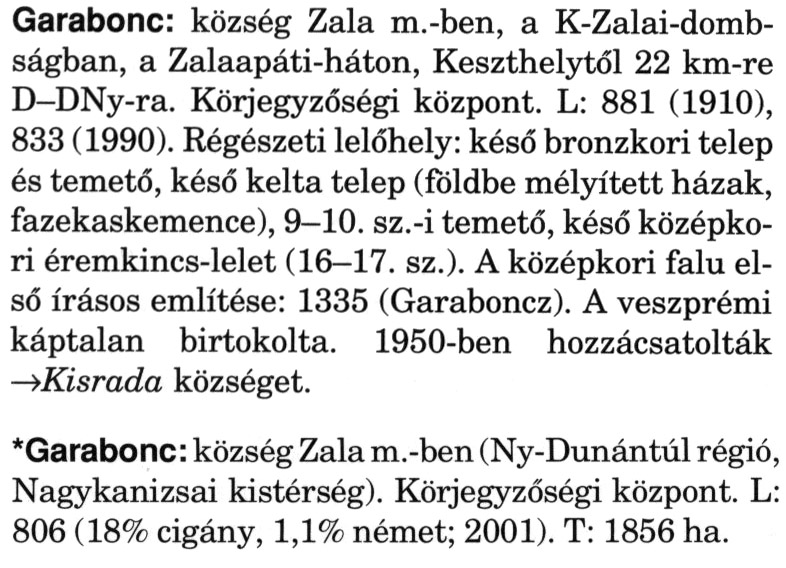 Nyilvános 2406 | 6365 | A szócikkek felismertetett szövege: | (A csillag után a kiegészítő kötetből származó szöveg következik) Garabonc: község Zala m.-ben, a K-Zalai-domb-ságban, a Zalaapáti-háton, Keszthelytől 22 km-re D-DNy-ra. Körjegyzőségi központ. L: 881 (1910), 833 (1990). Régészeti lelőhely: késő bronzkori telep és temető, késő kelta telep (földbe mélyített házak, fazekaskemence), 9-10. sz.-i temető, késő középkori éremkincs-lelet (16-17. sz.). A középkori falu első írásos említése: 1335 (Garaboncz). A veszprémi káptalan birtokolta. 1950-ben hozzácsatolták →Kisrada községet. *Garabonc: község Zala m.-ben (Ny-Dunántúl régió, Nagykanizsai kistérség). Körjegyzőségi központ. L: 806 (18% cigány, 1,1% német; 2001). T: 1856 ha. A szócikkek a következő lexikonból származnak: Cím: Magyar nagylexikon Közreműködő: Élesztős László (1949) (szerk.) ; Barabás Éva (1943) (szerk.) ; Berényi Gábor (1946) (szerk.) ; Bárány Lászlóné (szerk.) ; Adelmann-né Kertész Judit (1945) (közrem.) ; Froemel Károlyné Jáky Éva (1936) (közrem.) ; Akadémiai Kiadó és Nyomda Vállala Szerz. közl.: [... Élesztős László főszerk.] ; [szerk. Barabás Éva et al.] ; [bibliogr. Adelmanné Kertész Judit] ; [kész. az Akadémiai Kiadó Magyar Nagylexikon Szerkesztőségében] Kiadás: Budapest : Akad. K., 1993- Kötetei: 1. köt., A - Anc 2. köt., And - Bag 3. köt., Bah - Bij 4. köt., Bik - Bz 5. köt., C - Csem 6. köt., Csen - Ec 7. köt., Ed - Fe 8. köt., Ff - Gyep 9. köt., Gyer - Iq 10. köt., Ir - Kip 11. köt., Kir - Lem 12. köt., Len - Mep 13. köt., Mer - Nyk 14. köt., Nyl - Pom 15. köt., Pon - Sek 16. köt., Sel - Szö 17. köt., Szp - Ung 18. köt., Unh - Z 19. köt., Kiegészítő kötet, A - Z ETO jelzet: 030=945.11 Szakjelzet: 030 Cutter: M 14 ISBN: 963-05-6611-7 [!ISBN 963-05-6615-X] Nyelv: magyar Megjegyzés: Az 5. kötettől kiad. a Magyar Nagylexikon Kiadó ; A 6. kötettől főszerk. Berényi Gábor ; A 6. kötettől szakszerk. Bárány Lászlóné et al. ; A 6. kötettől bibliogr. Froemel Károlyné ; Bibliogr. a szócikkek végén |