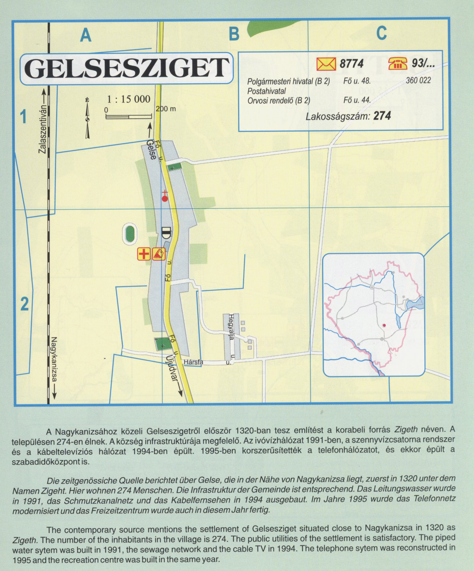 Nyilvános 2247 | 7559 | GELSESZIGET | A Nagykanizsához közeli Gelseszigetről először 1320-ban tesz említést a korabeli forrás Zigeth néven. A településen 274-en élnek. A község infrastruktúrája megfelelő. Az ivóvízhálózat 1991 -ben, a szennyvízcsatorna rendszer és a kábeltelevíziós hálózat 1994-ben épült. 1995-ben korszerűsítették a telefonhálózatot, és ekkor épült a szabadidőközpont is. Die zeitgenössiche Quelle berichtet über Gelse, die in der Nahe von Nagykanizsa liegt, zuerst in 1320 unter dem Namen Zigeht. Hier wohnen 274 Menschen. Die Infrastruktur der Gemeinde isi entsprechend. Das Leitungswasser wurde in 1991, das Schmutzkanalnetz und das Kabelfernsehen in 1994 ausgebaut. lm Jahre 1995 wurde das Telefonnetz modernisiert und das Freizeitzentrum wurde auch in diesem Jahr fertig. The contemporary source mentions the settlement of Gelsesziget situated close to Nagykanizsa in 1320 as Zigeth. The number of the inhabitants in the village is 274. The public Utilities of the settlement is satisfactory. The piped water sytem was built in 1991, the sewage network and the cable TV in 1994. The telephoné sytem was reconstructed in 1995 and the recreation centre was built in the same year. A részlet a következő kiadványból származik/Die Teile stammen vom volgenden Buch/This text came from the following book: Cím/Titel/Title: Zala megye településeinek atlasza - 257 település részletes térképe/Atlas der Komitat Zala - 257 Detailte Siedlungskarten/Zala county\'s Atlas - 257 settlement maps. Közreműködő/contributor: Lackner László (1943) (fotó) Kiadás/Ausgabe/Publisher: Gyula : HISZI-MAP, 1997 Sorozat/Serie/Series: Indulástól - megérkezésig... ETO: 912(439.121-2) ; 908.439.121 Cutter: Z 19 ISBN: 963-610-025-4 Oldalszám/Seiten/Pages: 323, 81 p. Megjegyzés/Note: Lezárva/Abgeschlossen am/Closed am: 1997. máj. 30. |