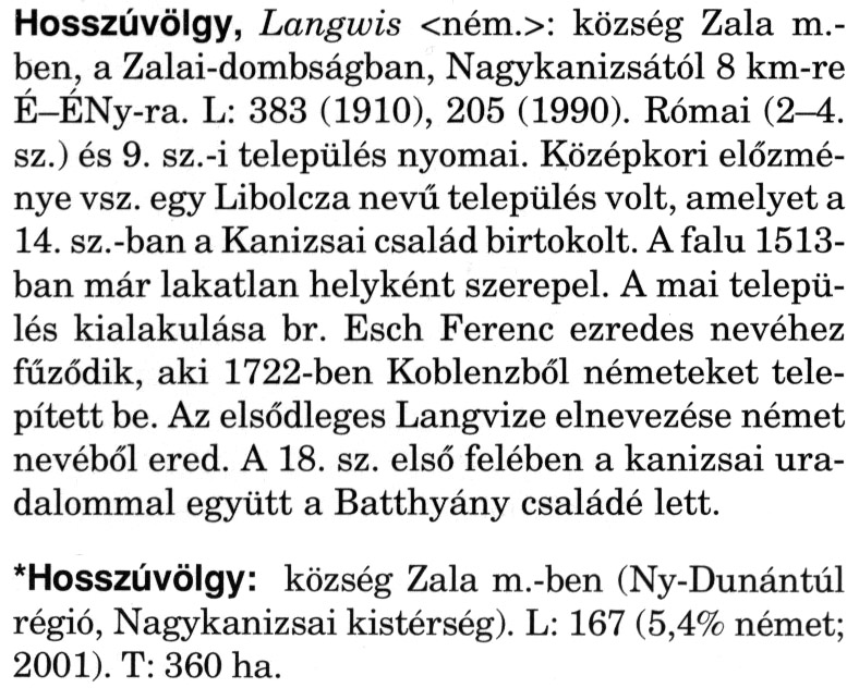 Nyilvános 2160 | 5931 | Rövid leírás | Teljes leírás (2.44 KB) | A szócikkek felismertetett szövege: (A csillag után a kiegészítő kötetből származó szöveg következik) Hosszúvölgy, Langwis <ném.>: község Zala m.-ben, a Zalai-dombságban, Nagykanizsától 8 km-re É-ÉNy-ra. L: 383 (1910), 205 (1990). Római (2-4. sz.) és 9. sz.-i település nyomai. Középkori előzménye vsz. egy Libolcza nevű település volt, amelyet a 14. sz.-ban a Kanizsai család birtokolt. A falu 1513-ban már lakatlan helyként szerepel. A mai település kialakulása br. Esch Ferenc ezredes nevéhez fűződik, aki 1722-ben Koblenzből németeket telepített be. Az elsődleges Langvize elnevezése német nevéből ered. A 18. sz. első felében a kanizsai uradalommal együtt a Batthyány családé lett. *Hosszúvölgy: község Zala m.-ben (Ny-Dunántúl régió, Nagykanizsai kistérség). L: 167 (5,4% német; 2001). T: 360 ha. A szócikkek a következő lexikonból származnak: Cím: Magyar nagylexikon Közreműködő: Élesztős László (1949) (szerk.) ; Barabás Éva (1943) (szerk.) ; Berényi Gábor (1946) (szerk.) ; Bárány Lászlóné (szerk.) ; Adelmann-né Kertész Judit (1945) (közrem.) ; Froemel Károlyné Jáky Éva (1936) (közrem.) ; Akadémiai Kiadó és Nyomda Vállala Szerz. közl.: [... Élesztős László főszerk.] ; [szerk. Barabás Éva et al.] ; [bibliogr. Adelmanné Kertész Judit] ; [kész. az Akadémiai Kiadó Magyar Nagylexikon Szerkesztőségében] Kiadás: Budapest : Akad. K., 1993- Kötetei: 1. köt., A - Anc 2. köt., And - Bag 3. köt., Bah - Bij 4. köt., Bik - Bz 5. köt., C - Csem 6. köt., Csen - Ec 7. köt., Ed - Fe 8. köt., Ff - Gyep 9. köt., Gyer - Iq 10. köt., Ir - Kip 11. köt., Kir - Lem 12. köt., Len - Mep 13. köt., Mer - Nyk 14. köt., Nyl - Pom 15. köt., Pon - Sek 16. köt., Sel - Szö 17. köt., Szp - Ung 18. köt., Unh - Z 19. köt., Kiegészítő kötet, A - Z ETO jelzet: 030=945.11 Szakjelzet: 030 Cutter: M 14 ISBN: 963-05-6611-7 [!ISBN 963-05-6615-X] Nyelv: magyar Megjegyzés: Az 5. kötettől kiad. a Magyar Nagylexikon Kiadó ; A 6. kötettől főszerk. Berényi Gábor ; A 6. kötettől szakszerk. Bárány Lászlóné et al. ; A 6. kötettől bibliogr. Froemel Károlyné ; Bibliogr. a szócikkek végén |