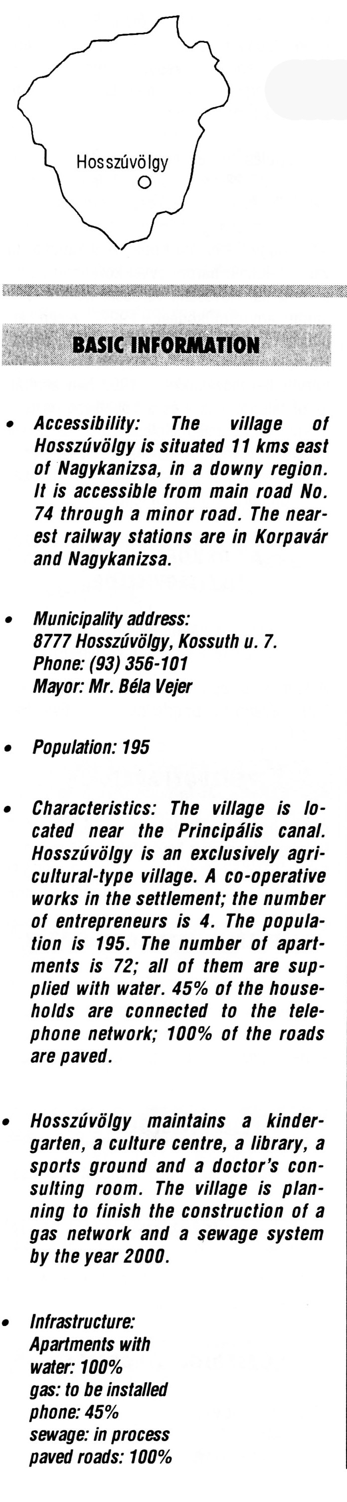 Nyilvános 2178 | 6264 | Hosszúvölgy | BASIC INFORMATION Accessibility: The village of Hosszúvölgy is situated 11 kms east of Nagykanizsa, in a downy region. It is accessible from main road No. 74 through a minor road. The nearest railway stations are in Korpavár and Nagykanizsa. Municipality address: 8777 Hosszúvölgy, Kossuth u. 7. Phone: (93) 356-101 Mayor: Mr. Béla Vejer Population: 195 Characteristics: The village is located near the Principális canal. Hosszúvölgy is an exclusively agricultural-type village. A co-operative works in the settlement; the number of entrepreneurs is 4. The population is 195. The number of apartments is 72; all of them are supplied with water. 45% of the households are connected to the telephone network; 100% of the roads are paved. • Hosszúvölgy maintains a kindergarten, a culture centre, a library, a sports ground and a doctor\'s consulting room. The village is planning to finish the construction of a gas network and a sewage system by the year 2000. • Infrastructure: Apartments with water: 100% gas: to be installed phone: 45% sewage: in process paved roads: 100% This text came from the following book: Title: Handbook of Zala county (Zala megye kézikönyve) Series: County handbooks of Hungary (Magyarország megyei kézikönyvei) Chief editor: Hóbor József Publisher: (Hatvan), CEBA-Hungary Ltd, 1998 ETO: 908.439.121(035) ; 050.8(439.121) ISBN: 963-9089-18-2 Pages: 488-1040 p. Remark: Closed on: 1998. márc. 31. |