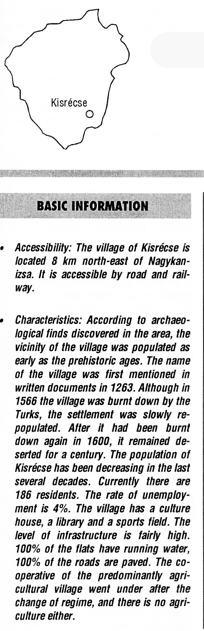 Nyilvános 2241 | 6126 | Rövid leírás | Teljes leírás (1.44 KB) | Kisrécse BASIC INFORMATION Accessibility: The village of Kisrécse is located 8 km north-east of Nagykanizsa. It is accessible by road and railway. Characteristics: According to archaeological finds discovered in the area, the vicinity of the village was populated as early as the prehistoric ages. The name of the village was first mentioned in written documents in 1263. Although in 1566 the village was burnt down by the Turks, the settlement was slowly re-populated. After it had been burnt down again in 1600, it remained deserted for a century. The population of Kisrécse has been decreasing in the last several decades. Currently there are 186 residents. The rate of unemployment is 4%. The village has a culture house, a library and a sports field. The level of infrastructure is fairly high. 100% of the flats have running water, 100% of the roads are paved. The cooperative of the predominantly agricultural village went under after the change of regime, and there is no agriculture either. This text came from the following book: Title: Handbook of Zala county (Zala megye kézikönyve) Series: County handbooks of Hungary (Magyarország megyei kézikönyvei) Chief editor: Hóbor József Publisher: (Hatvan), CEBA-Hungary Ltd, 1998 ETO: 908.439.121(035) ; 050.8(439.121) ISBN: 963-9089-18-2 Pages: 488-1040 p. Remark: Closed on: 1998. márc. 31. |