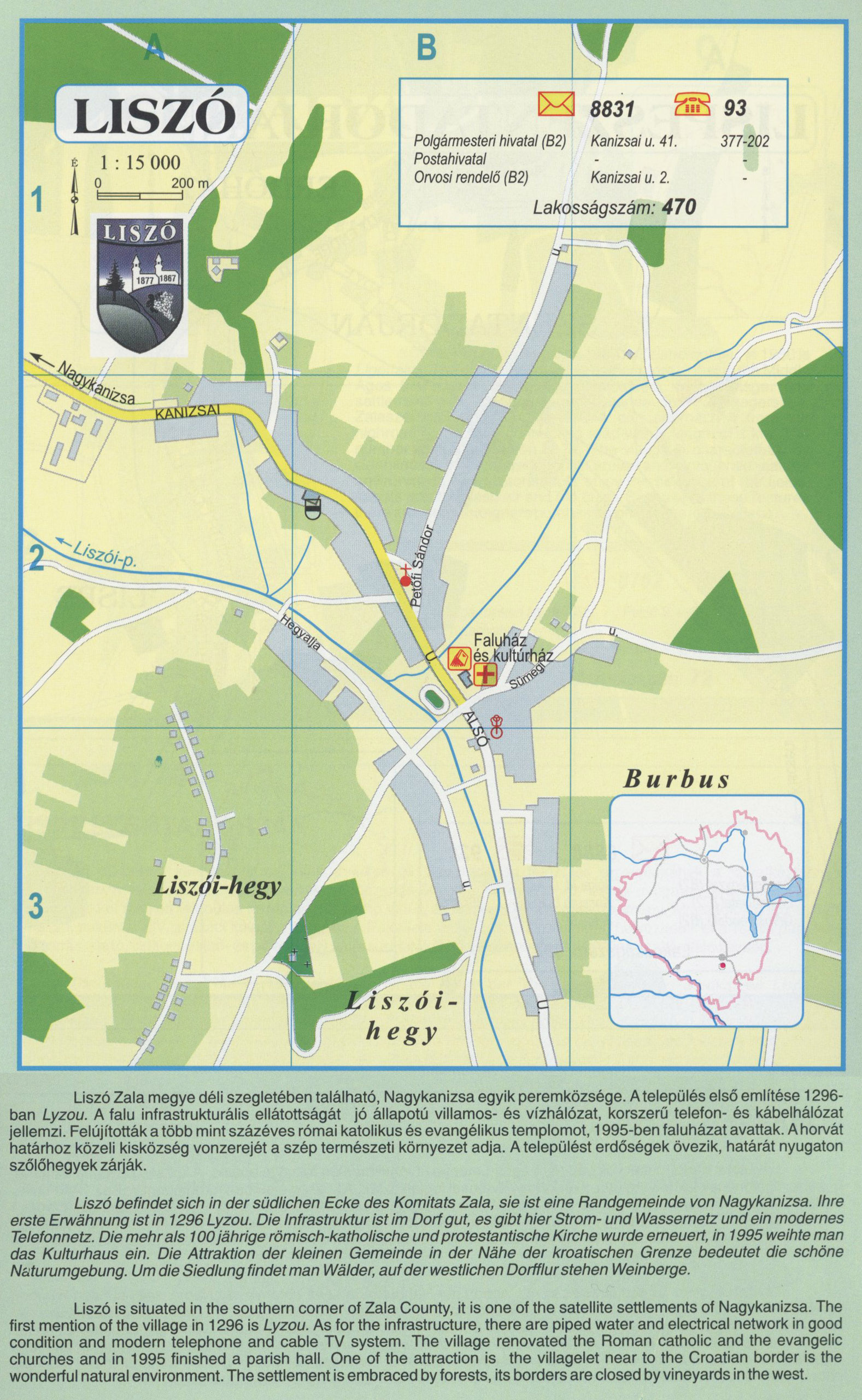 Nyilvános 2594 | 10272 | Liszó | Liszó Zala megye déli szegletében található, Nagykanizsa egyik peremközsége. A település első említése 1296-ban Lyzou. A falu infrastrukturális ellátottságát jó állapotú villamos- és vízhálózat, korszerű telefon- és kábelhálózat jellemzi. Felújították a több mint százéves római katolikus és evangélikus templomot, 1995-ben faluházat avattak. A horvát határhoz közeli kisközség vonzerejét a szép természeti környezet adja. A települést erdőségek övezik, határát nyugaton szőlőhegyek zárják. Liszó befindet sich in der südlichen Ecke des Komitats Zala, sie ist eine Randgemeinde von Nagykanizsa. Ihre erste Erwähnung ist in 1296 Lyzou. Die Infrastruktur ist im Dorf gut, es gibt hier Strom- und Wassernetz und ein modernes Telefonnetz. Die mehr als 100 jährige römisch-katholische und protestantische Kirche wurde erneuert, in 1995 weihte man das Kulturhaus ein. Die Attraktion der kleinen Gemeinde in der Nähe der kroatischen Grenze bedeutet die schöne Naturumgebung. Um die Siedlung findet man Wälder, auf der westlichen Dortflur stehen Weinberge. Liszó is situated in the southern corner of Zala County, it is one of the satellite settlements of Nagykanizsa. The first mention of the village in 1296 is Lyzou. As for the infrastructure, there are piped water and electrical network in good condition and modern telephone and cable TV system. The village renovated the Roman catholic and the evangelic churches and in 1995 finished a parish hall. One of the attraction is the villagelet near to the Croatian border is the wonderful natural environment. The settlement is embraced by forests, its borders are closed by vineyards in the west. A részlet a következő kiadványból származik/Die Teile stammen vom volgenden Buch/This text came from the following book: Cím/Titel/Title: Zala megye településeinek atlasza - 257 település részletes térképe/Atlas der Komitat Zala - 257 Detailte Siedlungskarten/Zala county\'s Atlas - 257 settlement maps. Közreműködő/contributor: Lackner László (1943) (fotó) Kiadás/Ausgabe/Publisher: Gyula : HISZI-MAP, 1997 Sorozat/Serie/Series: Indulástól - megérkezésig... ETO: 912(439.121-2) ; 908.439.121 Cutter: Z 19 ISBN: 963-610-025-4 Oldalszám/Seiten/Pages: 323, 81 p. Megjegyzés/Note: Lezárva/Abgeschlossen am/Closed am: 1997. máj. 30. |