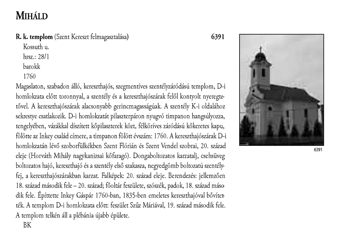 Nyilvános 2369 | 6616 | A részlet szövege: | MIHÁLD R. k. templom (Szent Kereszt felmagasztalása) 6391 Kossuth u. hrsz.: 28/1 barokk 1760 Magaslaton, szabadon álló, kereszthajós, szegmentíves szentélyzáródású templom, D-i homlokzata előtt toronnyal, a szentély és a kereszthajószárak felől kontyolt nyeregtetővel. A kereszthajószárak alacsonyabb gerincmagasságúak. A szentély K-i oldalához sekrestye csatlakozik. D-i homlokzatát pilaszterpáron nyugvó timpanon hangsúlyozza, tengelyében, vázákkal díszített kőpilaszterek közt, félköríves záródású kőkeretes kapu, fölötte az Inkey család címere, a timpanon fölött évszám: 1760. A kereszthajószárak D-i homlokzatán lévő szoborfülkékben Szent Flórián és Szent Vendel szobrai, 20. század eleje (Horváth Mihály nagykanizsai kőfaragó). Dongaboltozatos karzatalj, csehsüveg boltozatos hajó, kereszthajó és a szentély első szakasza, negyedgömb boltozatú szentélyfej, a kereszthajószárakban karzat. Falképek: 20. század eleje. Berendezés: jellemzően 18. század második fele – 20. század; főoltár feszülete, szószék, padok, 18. század második fele. Építtette Inkey Gáspár 1760-ban, 1835-ben emeletes kereszthajóval bővítették. A templom D-i homlokzata előtt: feszület Szűz Máriával, 19. század második fele. A templom telkén áll a plébánia újabb épülete. BK A részlet a következő könyv online változatából származik: Cím: Magyarország műemlékjegyzéke Közreműködő: Haris Andrea. (szerk.) ; Kulturális Örökségvédelmi Hivatal (Budapest) (közread.) ; Somorjay Sélysette. (szerk.) ; Bardoly István (közrem.) Szerz. közl.: [sorozatszerk. Haris Andrea, Somorjay Sélysette] ; [mtárs Bardoly István] ; [közread. a] Kulturális Örökségvédelmi Hivatal. Kiadás: Budapest : KÖH, 2006 Kötetadat: Zala megye ISBN: 963-86510-7-5 ö ISBN: 963 7474 10 2 Nyelv: magyar A jegyzék a Kultúrális Örökségvédelmi Hivatal honlapján, a következő link alatt található: http://www.koh.hu/index.php?_mp=nyitolap&_amp=MUEML A fejléc adatairól 1. Objektum neve – törzsszám A fejléc első sora a műemlék eredeti rendeltetésének megfelelő nevet tartalmazza. Mögötte zárójelben templom esetében annak titulusa, más épületeknél indokolt esetben az eredeti rendeltetéstől eltérő, mai használatra utaló intézmény név (pl. városháza, múzeum, szálloda, oktatási intézmény hivatalos neve, stb.) olvasható. A törzsszám (trsz.) a műemlék egyetlen soha nem változó adata. A gyors azonosítás, illetve a törzsszám szerinti keresés lehetősége végett az objektummal egy sorban, a fejléc jobb szélén kiemelten jelenik meg. Összetartozó műemlék részek vagy történetileg egy együttest alkotó műemlékek sokszor külön törzsszámon lettek műemlékké nyilvánítva. Előfordulhat ezért, hogy egy fejléc alatt a leíró részben több, külön törzsszámmal rendelkező objektum szerepel. A törzsszámot ezekben az esetekben is az objektummal egy sorban tüntetjük fel. 2. Utca, házszám Egy utcán belül, amennyiben a számozás ezt lehetővé teszi, először a templomot adjuk meg, ezt követi a parókia, majd egyéb objektumok, pl. szobrok következnek. Házszám nélkül említünk egyes műemlékfajtákat (elsősorban templomokat), amennyiben a topográfiai azonosítás szempontjából a házszám közömbös vagy éppen zavaró. Előfordul, hogy a műemlék nem köthető nevesített közterülethez. Az ilyeneket a település végéhez soroltuk, és a leírásban kitértünk a településen belül elfoglalt helyükre. 3. Helyrajzi szám Ha egy helyrajzi számon és egy címen (pl. temetőben) több, külön törzsszámmal védett objektum van, akkor az együttesre utaló műemlék megnevezés alatt a közös adatokat egyszer adjuk meg. Ezt követően külön címszavanként következik a műemlékek leírása. Ilyen esetben az emlékeket mutatóztuk. Ezt az eljárást követtük, tekintet nélkül arra, hogy a teljes együttes védett-e vagy sem. (Védett együttes mellett mindig törzsszám szerepel.) Ha több helyrajzi szám is tartozik egy törzsszámhoz, akkor a fejlécben valamennyi számot feltüntettük. Amennyiben ilyen esetben több elemből álló műemlékről van szó, akkor a leíró részben minden külön említett elem után zárójelben megadjuk a vonatkozó helyrajzi számot. 4. Stílus A műemléket jelenleg meghatározó, domináns stílusjegy alapján került meghatározásra. Egyéb, érzékelhető stíluselemekre a leíró részben utalunk. 5. Datálás A műemléket jelenleg leginkább jellemző építési dátum. Korábbi építési periódusokra, illetve későbbi átépítésekre a történeti részben utalunk, fennmaradt részletek esetén lehetőség szerint azokra vonatkoztatva. A leírás A műemlékek leírása tartalmilag öt szakaszból áll, amely folyamatos szövegként jelenik meg. Az objektum topográfiai meghatározása a műemlék településen belüli vagy ahhoz viszonyított helyét adja meg, amennyiben ez az azonosításhoz nélkülözhetetlen, avagy azt segíti. Az emlék jellegének leírása utal a környezettel való kapcsolatra (tájolás, beépítés módja, környező terepviszonyok, amennyiben ezek jellemzőek), alaprajzi elrendezésre, tömegre és a jellegzetes homlokzati elemekre (pl. rizalitok, erkélyek, stb.). Részletes homlokzatleírás nem volt cél. Belső építészeti részletet csak akkor említünk meg, ha ez tartozékként jelentős, esetleg a datálás vagy a stílus meghatározás alapjául szolgált. Ezt követi az épület tartozékainak és berendezésének utalásszerű ismertetése (falfestés, üvegablak, berendezés), az adott elem után zárójelben az ismert mesterek nevével; az orgonát külön említjük, amennyiben hangszerként is műemléki értékkel bír. A mesternevekre, berendezésre történő utalás jelzésszerű, tétele