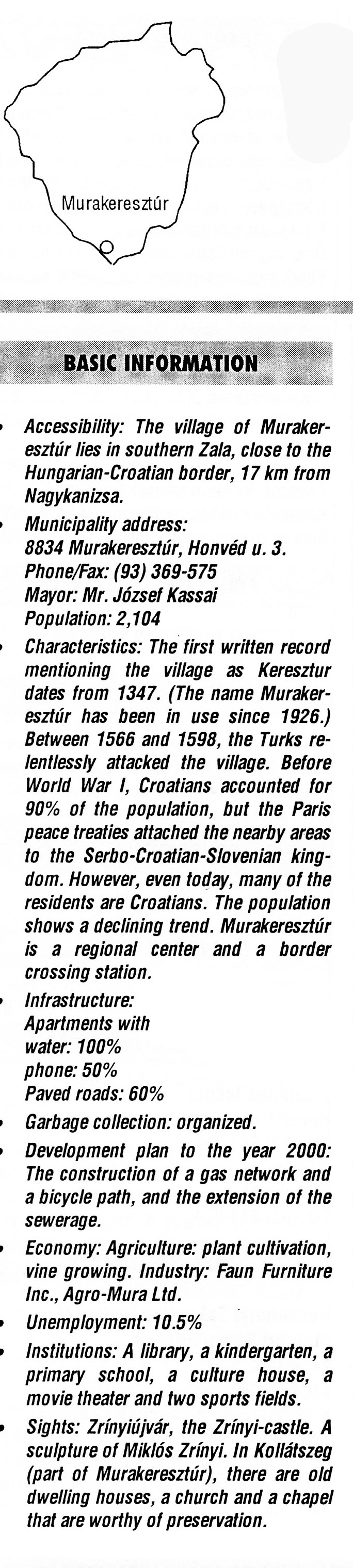 Nyilvános 1926 | 5609 | Rövid leírás | Teljes leírás (1.97 KB) | Murakeresztúr BASIC INFORMATION Accessibility: The village of Murakeresztúr lies in southern Zala, close to the Hungarian-Croatian border, 17 km from Nagykanizsa. Municipality address: 8834 Murakeresztúr, Honvéd u. 3. Phone/Fax: (93) 369-575 Mayor: Mr. József Kassai Population: 2,104 Characteristics: The first written record mentioning the village as Keresztur dates from 1347. (The name Murakeresztúr has been in use since 1926.) Between 1566 and 1598, the Turks relentlessly attacked the village. Before World War I, Croatians accounted for 90% of the population, but the Paris peace treaties attached the nearby areas to the Serbo-Croatian-Slovenian kingdom. However, even today, many of the residents are Croatians. The population shows a declining trend. Murakeresztúr is a regional center and a border crossing station. Infrastructure: Apartments with water: 100% phone: 50% Paved roads: 60% Garbage collection: organized. Development plan to the year 2000: The construction of a gas network and a bicycle path, and the extension of the sewerage. Economy: Agriculture: plant cultivation, vine growing. Industry: Faun Furniture Inc., Agro-Mura Ltd. Unemployment: 10.5% Institutions: A library, a kindergarten, a primary school, a culture house, a movie theater and two sports fields. Sights: Zrínyiújvár, the Zrínyi-castle. A sculpture of Miklós Zrínyi. In Kollátszeg (part of Murakeresztúr), there are old dwelling houses, a church and a chapel that are worthy of preservation. This text came from the following book: Title: Handbook of Zala county (Zala megye kézikönyve) Series: County handbooks of Hungary (Magyarország megyei kézikönyvei) Chief editor: Hóbor József Publisher: (Hatvan), CEBA-Hungary Ltd, 1998 ETO: 908.439.121(035) ; 050.8(439.121) ISBN: 963-9089-18-2 Pages: 488-1040 p. Remark: Closed on: 1998. márc. 31. |