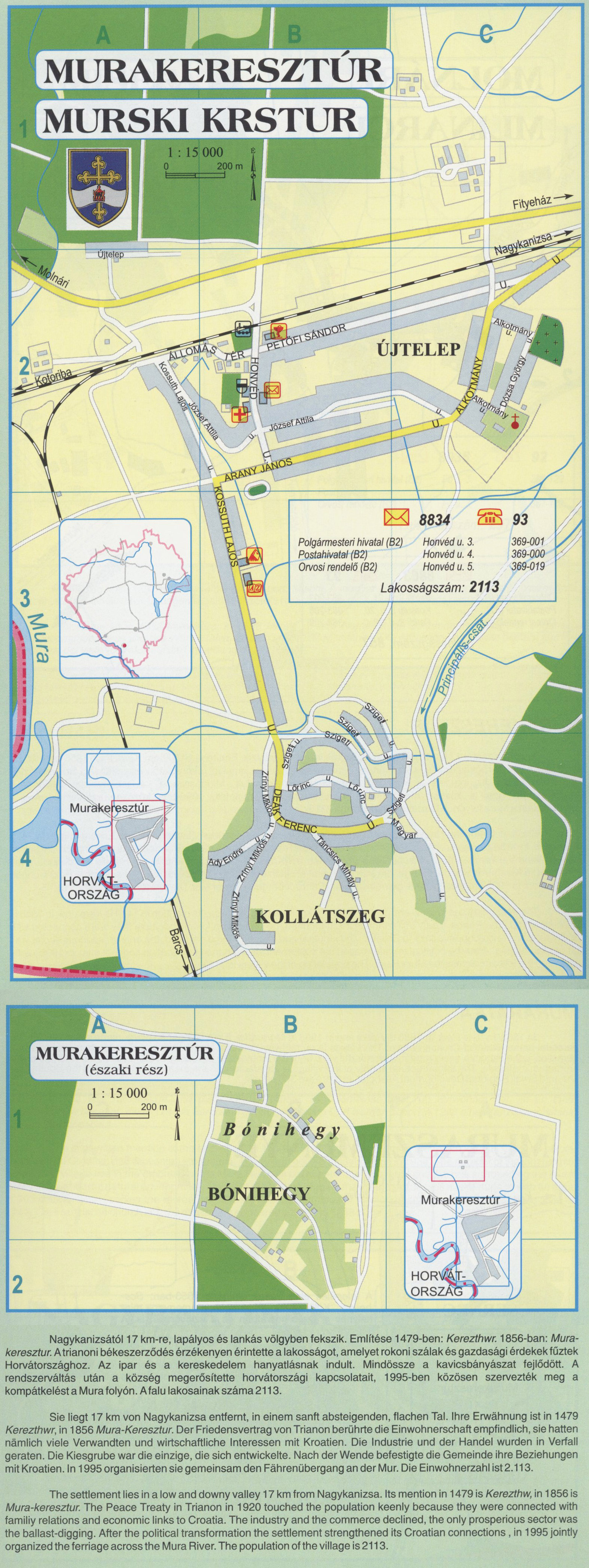 Nyilvános 2035 | 8130 | Rövid leírás | Teljes leírás (2.44 KB) | MURAKERESZTÚR Nagykanizsától 17 km-re, lapályos és lankás völgyben fekszik. Említése 1479-ben: Kerezthwr. 1856-ban: Mura-keresztur. A trianoni békeszerződés érzékenyen érintette a lakosságot, amelyet rokoni szálak és gazdasági érdekek fűztek Horvátországhoz. Az ipar és a kereskedelem hanyatlásnak indult. Mindössze a kavicsbányászat fejlődött. A rendszerváltás után a község megerősítette horvátországi kapcsolatait, 1995-ben közösen szervezték meg a kompátkelést a Mura folyón. A falu lakosainak száma 2113. Sie liegt 17 km von Nagykanizsa entfernt, in einem sanft absteigenden, flachen Tal. Ihre Erwähnung ist in 1479 Kerezthwr, in 1856 Mura-Keresztur. Der Friedensvertrag von Trianon berührte die Einwohnerschaft empfindlich, sie hatten nämlich viele Verwandten und wirtschaftliche Interessen mit Kroatien. Die Industrie und der Handel wurden in Verfall geraten. Die Kiesgrube war die einzige, die sich entwickelte. Nach der Wende befestigte die Gemeinde ihre Beziehungen mit Kroatien. In 1995 organisierten sie gemeinsam den Fährenübergang an der Mur. Die Einwohnerzahl ist2.113. The settlement lies in a low and downy valley 17 km from Nagykanizsa. Its mention in 1479 is Kerezthw, in 1856 is Mura-keresztur. The Peace Treaty in Trianon in 1920 touched the population keenly because they were connected with familiy relations and economic links to Croatia. The industry and the commerce declined, the only prosperious sector was the ballast-digging. After the political transformation the settlement strengthened its Croatian connections , in 1995 jointly organized the ferriage across the Mura River. The population of the village is 2113. A részlet a következő kiadványból származik/Die Teile stammen vom volgenden Buch/This text came from the following book: Cím/Titel/Title: Zala megye településeinek atlasza - 257 település részletes térképe/Atlas der Komitat Zala - 257 Detailte Siedlungskarten/Zala county\'s Atlas - 257 settlement maps. Közreműködő/contributor: Lackner László (1943) (fotó) Kiadás/Ausgabe/Publisher: Gyula : HISZI-MAP, 1997 Sorozat/Serie/Series: Indulástól - megérkezésig... ETO: 912(439.121-2) ; 908.439.121 Cutter: Z 19 ISBN: 963-610-025-4 Oldalszám/Seiten/Pages: 323, 81 p. Megjegyzés/Note: Lezárva/Abgeschlossen am/Closed am: 1997. máj. 30. |