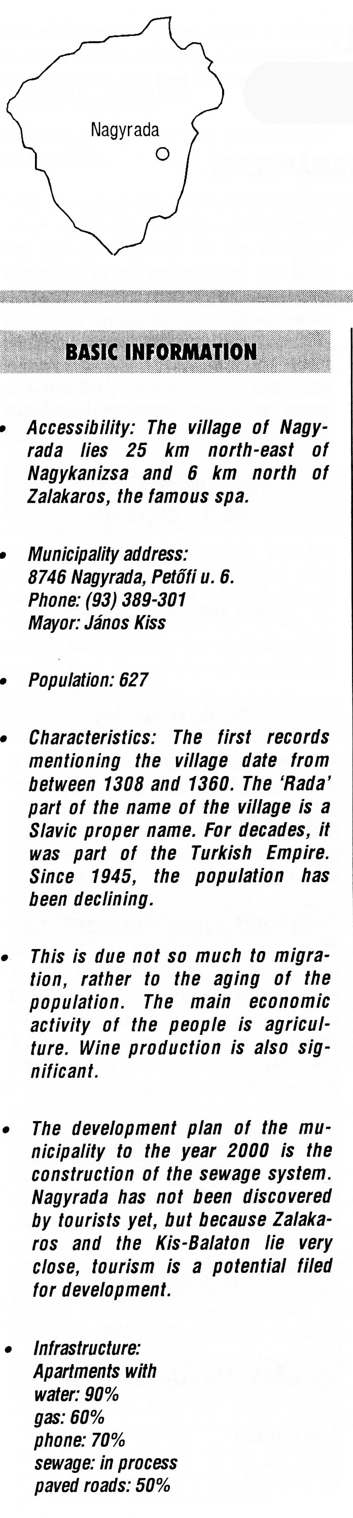 Nyilvános 2128 | 5763 | Nagyrada | BASIC INFORMATION Accessibility: The village of Nagy¬rada lies 25 km north-east of Nagykanizsa and 6 km north of Zalakaros, the famous spa. Municipality address: 8746 Nagyrada, Petőfi u. 6. Phone: (93) 389-301 Mayor: János Kiss Population: 627 Characteristics: The first records mentioning the village date from between 1308 and 1360. The \'Rada\' part of the name of the village is a Slavic proper name. For decades, it was part of the Turkish Empire. Since 1945, the population has been declining. This is due not so much to migra¬tion, rather to the aging of the population. The main economic activity of the people is agricul¬ture. Wine production is also sig¬nificant. The development plan of the mu¬nicipality to the year 2000 is the construction of the sewage system. Nagyrada has not been discovered by tourists yet, but because Zalaka-ros and the Kis-Balaton lie very close, tourism is a potential filed for development. Infrastructure: Apartments with water: 90% gas: 60% phone: 70% sewage: in process paved roads: 50% This text came from the following book: Title: Handbook of Zala county (Zala megye kézikönyve) Series: County handbooks of Hungary (Magyarország megyei kézikönyvei) Chief editor: Hóbor József Publisher: (Hatvan), CEBA-Hungary Ltd, 1998 ETO: 908.439.121(035) ; 050.8(439.121) ISBN: 963-9089-18-2 Pages: 488-1040 p. Remark: Closed on: 1998. márc. 31. |