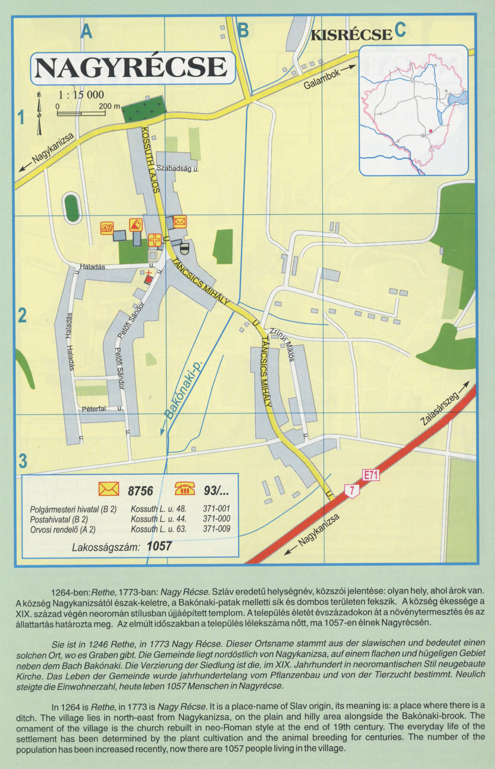 Nyilvános 2538 | 9139 | NAGYRÉCSE | 1264-ben: Rethe, 1773-ban: Nagy Récse. Szláv eredetű helységnév, közszói jelentése: olyan hely, ahol árok van. A község Nagykanizsától észak-keletre, a Bakónaki-patak melletti sík és dombos területen fekszik. A község ékessége a XIX. század végén neoromán stílusban újjáépített templom. A település életét évszázadokon át a növénytermesztés és az állattartás határozta meg. Az elmúlt időszakban a település lélekszáma nőtt, ma 1057-en élnek Nagyrécsén. Sie ist in 1246 Rethe, in 1773 Nagy Récse. Dieser Ortsname stammt aus der slawischen und bedeutet einen solchen Ort, wo es Graben gibt. Die Gemeinde liegt nordöstlich von Nagykanizsa, auf einem flachen und hügeligen Gebiet neben dem Bach Bakónaki. Die Verzierung der Siedlung ist die, im XIX. Jahrhundert in neoromantischen Stil neugebaute Kirche. Das Leben der Gemeinde wurde jahrhundertelang vom Pflanzenbau und von der Tierzucht bestimmt. Neulich steigte die Einwohnerzahl, heute leben 1057 Menschen in Nagyrécse. In 1264 is Rethe, in 1773 is Nagy Récse. It is a place-name of Slav origin, its meaning is: a place where there is a ditch. The village lies in north-east from Nagykanizsa, on the plain and hilly area alongside the Bakónaki-brook. The ornament of the village is the church rebuilt in neo-Roman style at the end of 19th century. The everyday life of the settlement has been determined by the plant cultivation and the animal breeding for centuries. The number of the population has been increased recently, now there are 1057 people living in the village. A részlet a következő kiadványból származik/Die Teile stammen vom volgenden Buch/This text came from the following book: Cím/Titel/Title: Zala megye településeinek atlasza - 257 település részletes térképe/Atlas der Komitat Zala - 257 Detailte Siedlungskarten/Zala county\'s Atlas - 257 settlement maps. Közreműködő/contributor: Lackner László (1943) (fotó) Kiadás/Ausgabe/Publisher: Gyula : HISZI-MAP, 1997 Sorozat/Serie/Series: Indulástól - megérkezésig... ETO: 912(439.121-2) ; 908.439.121 Cutter: Z 19 ISBN: 963-610-025-4 Oldalszám/Seiten/Pages: 323, 81 p. Megjegyzés/Note: Lezárva/Abgeschlossen am/Closed am: 1997. máj. 30. |