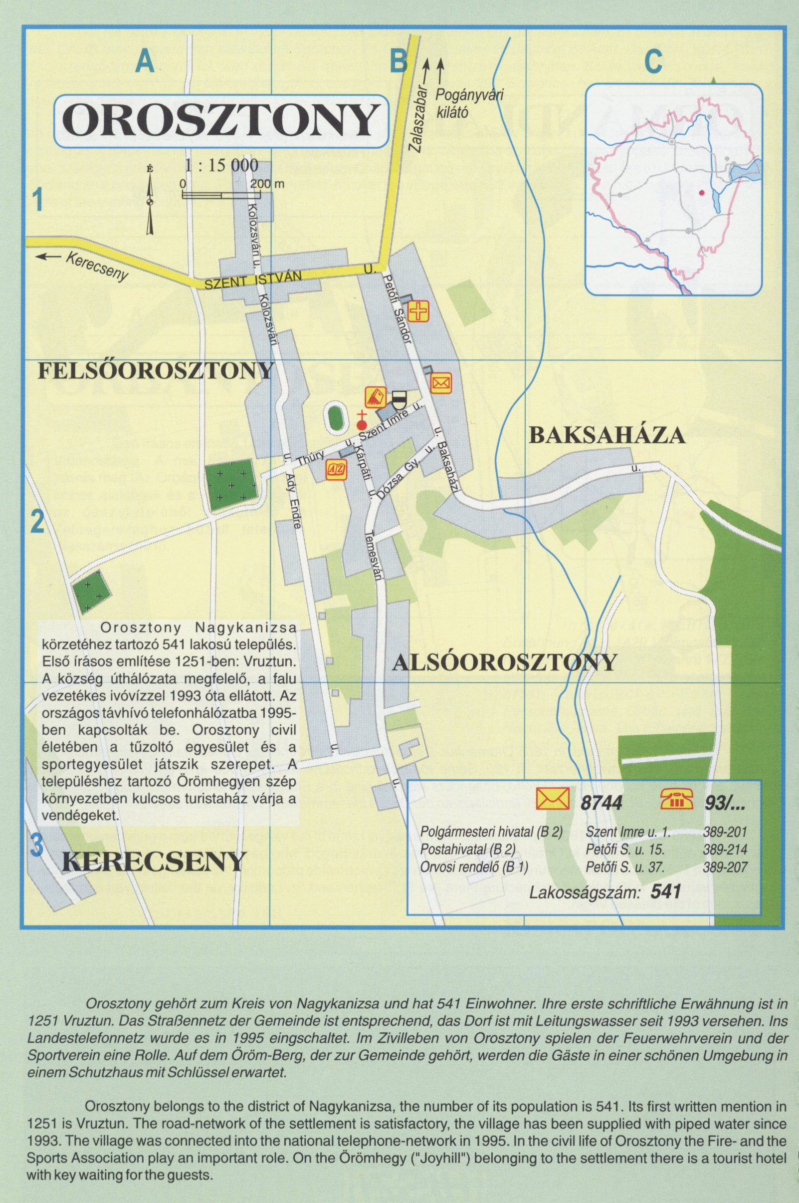 Nyilvános 2657 | 9993 | OROSZTONY | Orosztony Nagykanizsa körzetéhez tartozó 541 lakosú település. Első írásos említése 1251-ben: Vruztun. A község úthálózata megfelelő, a falu. vezetékes ivóvízzel 1993 óta ellátott. Az országos távhívó telefonhálózatba 1995-ben kapcsolták be. Orosztony civil életében a tűzoltó egyesület és a sportegyesület játszik szerepet. A településhez tartozó Örömhegyen szép környezetben kulcsos turistaház várja a vendégeket. Orosztony gehört zum Kreis von Nagykanizsa und hat 541 Einwohner. Ihre erste schriftliche Erwähnung ist in 1251 Vruztun. Das Straßennetz der Gemeinde ist entsprechend, das Dorf ist mit Leitungswasser seit 1993 versehen. Ins Landestelefonnetz wurde es in 1995 eingschaltet. Im Zivilleben von Orosztony spielen der Feuerwehrverein und der Sportverein eine Rolle. Auf dem Öröm-Berg, der zur Gemeinde gehört, werden die Gäste in einer schönen Umgebung in einem Schutzhaus mit Schlüssel erwartet. Orosztony belongs to the district of Nagykanizsa, the number of its population is 541. Its first written mention in 1251 is Vruztun. The road-network of the settlement is satisfactory, the village has been supplied with piped water since 1993. The village was connected into the national telephone-network in 1995. In the civil life of Orosztony the Fire- and the Sports Association play an important role. On the Örömhegy ("Joyhill") belonging to the settlement there is a tourist hotel with key waiting forthe guests. A részlet a következő kiadványból származik/Die Teile stammen vom volgenden Buch/This text came from the following book: Cím/Titel/Title: Zala megye településeinek atlasza - 257 település részletes térképe/Atlas der Komitat Zala - 257 Detailte Siedlungskarten/Zala county\'s Atlas - 257 settlement maps. Közreműködő/contributor: Lackner László (1943) (fotó) Kiadás/Ausgabe/Publisher: Gyula : HISZI-MAP, 1997 Sorozat/Serie/Series: Indulástól - megérkezésig... ETO: 912(439.121-2) ; 908.439.121 Cutter: Z 19 ISBN: 963-610-025-4 Oldalszám/Seiten/Pages: 323, 81 p. Megjegyzés/Note: Lezárva/Abgeschlossen am/Closed am: 1997. máj. 30. |
