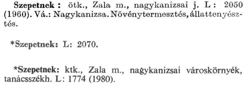 Nyilvános 2060 | 5507 | A szócikkek felismertetett szövege: | (Az első csillag után az 1972-es, a második csillag után az 1981-es kiadású kiegészítő kötetből származó szöveg következik) Szepetnek: ötk., Zala m., nagykanizsai j. L: 2050 (1960). Vá.: Nagykanizsa. Növénytermesztés, állattenyésztés. *Szepetnek: L: 2070. *Szepetnek: ktk., Zala m., nagykanizsai városkörnyék, tanácsszékh. L: 1774 (1980). A szócikkek a következő lexikonból származnak: Cím: Új magyar lexikon Közreműködő: Berei Andor (1900-1979) (szerk.) Szerz. közl.: [szerk. Berei Andor et al.] Kiadás jelzés: 2. lny. Kiadás: Budapest : Akad. K., 1961-1962 Kötetei: 1., A - C 2., D - F 3., G - J 4., K - Me 5., Mf - R 6., S - Z 7. köt., A-Z Kiegészítő kötet (1972) Kiegészítő kötet, 1962÷1980 (1981) ETO jelzet: 03=945.11 Szakjelzet: 030 Cutter: U 28 Nyelv: magyar Megjegyzés: Bibliogr. a címszavak egy részének végén |