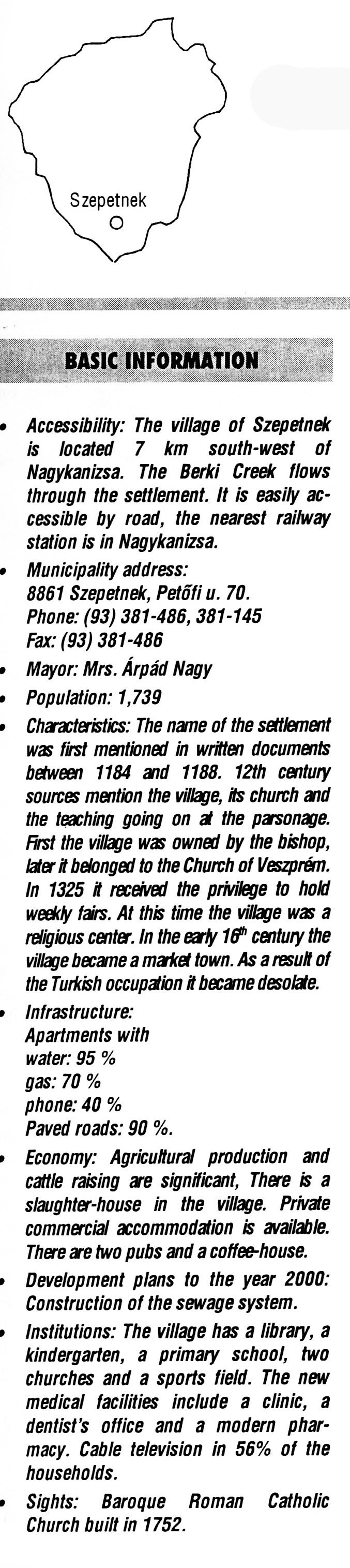 Nyilvános 2125 | 5689 | Szepetnek | BASIC INFORMATION Accessibility: The village of Szepetnek is located 7 km south-west of Nagykanizsa. The Berki Creek flows through the settlement. It is easily accessible by road, the nearest railway station is in Nagykanizsa. Municipality address: 8861 Szepetnek, Petőfi u. 70. Phone: (93) 381-486, 381-145 Fax: (93) 381-486 Mayor: Mrs. Árpád Nagy Population: 1,739 Characteristics: The name of the settlement was first mentioned in written documents between 1184 and 1188. 12th century sources mention the village, its church and the teaching going on at the parsonage. First the village was owned by the bishop, later it belonged to the Church of Veszprém. In 1325 it received the privilege to hold weekly fairs. At this time the village was a religious center. In the early 16th century the village became a market town. As a result of the Turkish occupation it became desolate. Infrastructure: Apartments with water: 95 % gas: 70 % phone: 40 % Paved roads: 90 %. Economy: Agricultural production and cattle raising are significant, There is a slaughter-house in the village. Private commercial accommodation is available. There are two pubs and a coffee-house. Development plans to the year 2000: Construction of the sewage system. Institutions: The village has a library, a kindergarten, a primary school, two churches and a sports field. The new medical facilities include a clinic, a dentist\'s office and a modern pharmacy. Cable television in 56% of the households. Sights: Baroque Roman Catholic Church built in 1752. This text came from the following book: Title: Handbook of Zala county (Zala megye kézikönyve) Series: County handbooks of Hungary (Magyarország megyei kézikönyvei) Chief editor: Hóbor József Publisher: (Hatvan), CEBA-Hungary Ltd, 1998 ETO: 908.439.121(035) ; 050.8(439.121) ISBN: 963-9089-18-2 Pages: 488-1040 p. Remark: Closed on: 1998. márc. 31. |
