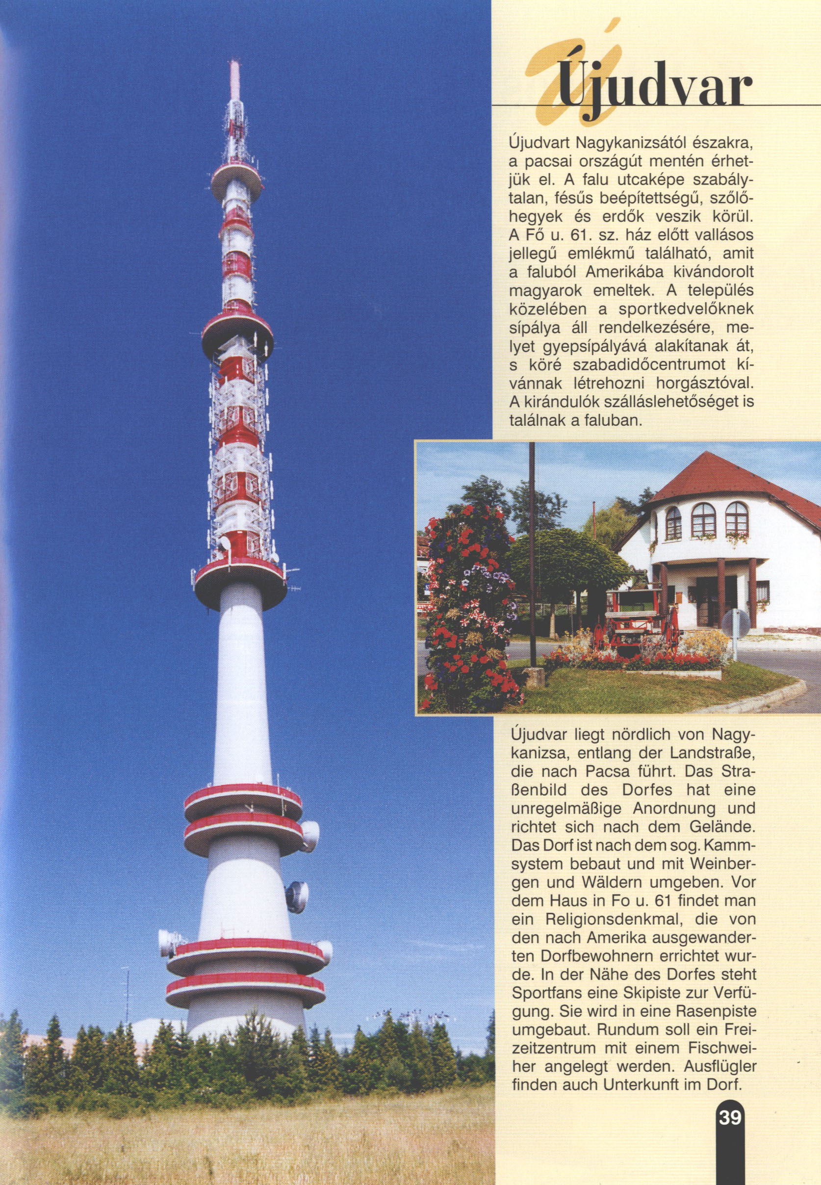 Nyilvános 2319 | 6265 | Újudvar | Újudvar liegt nördlich von Nagykanizsa, entlang der Landstraße, die nach Pacsa führt. Das Straßenbild des Dorfes hat eine unregelmäßige Anordnung und richtet sich nach dem Gelände. Das Dorf ist nach dem sog. Kammsystem bebaut und mit Weinbergen und Wäldern umgeben. Vor dem Haus in Fo u. 61 findet man ein Religionsdenkmal, die von den nach Amerika ausgewanderten Dorfbewohnern errichtet wurde. In der Nähe des Dorfes steht Sportfans eine Skipiste zur Verfügung. Sie wird in eine Rasenpiste umgebaut. Rundum soll ein Freizeitzentrum mit einem Fischweiher angelegt werden. Ausflügler finden auch Unterkunft im Dorf. Dieses Text stammt von: Titel: Hívogató a Régiók Kapujában - Útikönyv Látnivalók Nagykanizsán és Térségében (Einladend in dem Tor des Gebiets - Reisebuch - Sehenswürdigkeiten in Nagykanizsa und Umgebung) Herausgegeben von: Nagykanizsa és a Környező Települések Területfejlesztési Társulása (Verein für Gebietsentwicklung in Nagykanizsa und in ihrer Umgebung) 8800 Nagykanizsa, Petőfi Sándor út 5. Tel.: 06 93/536-453 • 06 93/536-454 Tel ./Fax: 06 93/326-323 E-mail: terstars@axelero.hu www.kanizsaterseg.celodin.hu |
