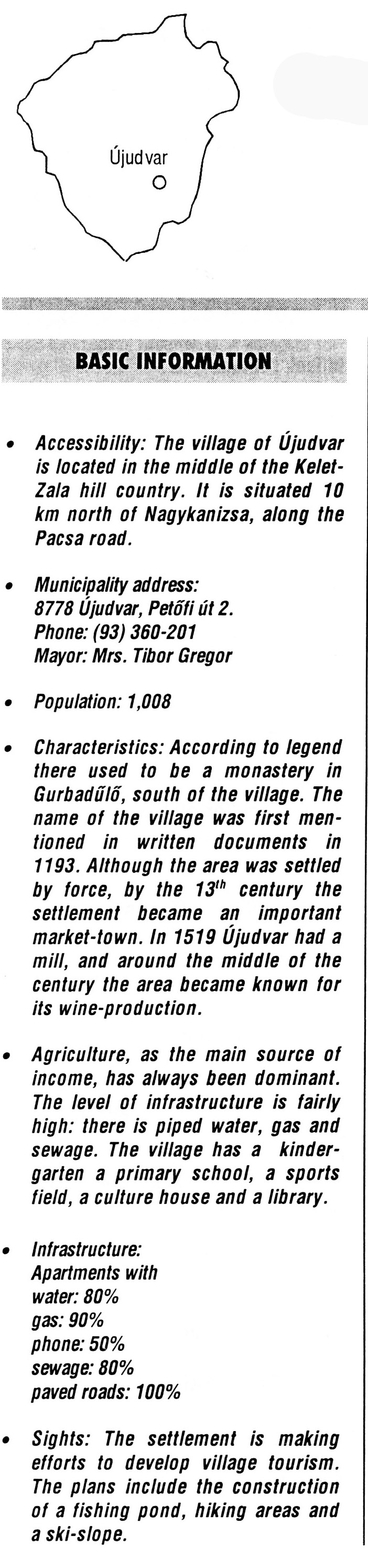 Nyilvános 2266 | 6297 | Újudvar | BASIC INFORMATION Accessibility: The village of Újudvar is located in the middle of the Kelet-Zala hill country. It is situated 10 km north of Nagykanizsa, along the Pacsa road. Municipality address: 8778 Újudvar, Petőfi út 2. Phone: (93) 360-201 Mayor: Mrs. Tibor Gregor Population: 1,008 Characteristics: According to legend there used to be a monastery in Gurbadűlő, south of the village. The name of the village was first mentioned in written documents in 1193. Although the area was settled by force, by the 13th century the settlement became an important market-town. In 1519 Újudvar had a mill, and around the middle of the century the area became known for its wine-production. Agriculture, as the main source of income, has always been dominant. The level of infrastructure is fairly high: there is piped water, gas and sewage. The village has a kindergarten a primary school, a sports field, a culture house and a library. Infrastructure: Apartments with water: 80% gas: 90% phone: 50% sewage: 80% paved roads: 100% Sights: The settlement is making efforts to develop village tourism. The plans include the construction of a fishing pond, hiking areas and a ski-slope. This text came from the following book: Title: Handbook of Zala county (Zala megye kézikönyve) Series: County handbooks of Hungary (Magyarország megyei kézikönyvei) Chief editor: Hóbor József Publisher: (Hatvan), CEBA-Hungary Ltd, 1998 ETO: 908.439.121(035) ; 050.8(439.121) ISBN: 963-9089-18-2 Pages: 488-1040 p. Remark: Closed on: 1998. márc. 31. |
