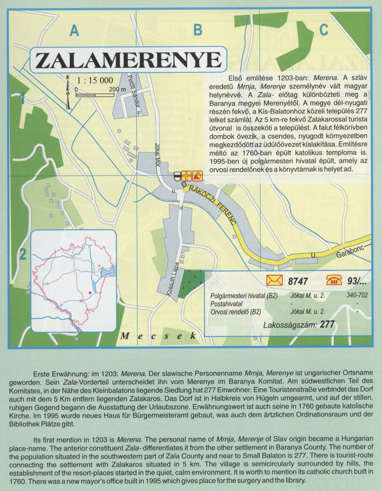 Nyilvános 2289 | 8736 | Zalamerenye | Első említése 1203-ban: Merena. A szláv eredetű Mrnja, Merenje személynév vált magyar helynévvé. A Zala- előtag különbözteti meg a Baranya megyei Merenyétől. A megye dél-nyugati részén fekvő, a Kis-Balatonhoz közeli település 277 lelket számlál. Az 5 km-re fekvő Zalakarossal turista útvonal is összeköti a települést. A falut félkörívben dombok övezik, a csendes, nyugodt környezetben megkezdődött az üdülőövezet kialakítása. Említésre méltó az 1760-ban épült katolikus temploma is. 1995-ben új polgármesteri hivatal épült, amely az orvosi rendelőnek és a könyvtárnak is helyet ad. Erste Erwähnung: im 1203: Merena. Der slawische Personenname Mrnja, Merenye ist ungarischer Ortsname geworden. Sein Zala-Vorderteil unterscheidet ihn vom Merenye im Baranya Komitat. Am südwestlichen Teil des Komitates, in der Nähe des Kleinbalatons liegende Siedlung hat 277 Einwohner. Eine Touristenstraße verbindet das Dorf auch mit dem 5 Km entfern liegenden Zalakaros. Das Dorf ist in Halbkreis von Hügeln umgearmt, und auf der stillen, ruhigen Gegend begann die Ausstattung der Urlaubszone. Erwähnungswert ist auch seine in 1760 gebaute katolische Kirche. Im 1995 wurde neues Haus für Bürgermeisteramt gebaut, was auch dem ärtzlichen Ordinationsraum und der Bibliothek Plätze gibt. Its first mention in 1203 is Merena. The personal name of Mrnja, Merenje of Slav origin became a Hungarian place-name. The anterior constituent Zala- differentiates it from the other settlement in Baranya County. The number of the population situated in the southwestern part of Zala County and near to Small Balaton is 277. There is tourist-route connecting the settlement with Zalakaros situated in 5 km. The village is semicircularly surrounded by hills, the establishment of the resort-places started in the quiet, calm environment. It is worth to mention its catholic church built in 1760. There was a new mayor\'s office built in 1995 which gives place forthe surgery and the library. A részlet a következő kiadványból származik/Die Teile stammen vom volgenden Buch/This text came from the following book: Cím/Titel/Title: Zala megye településeinek atlasza - 257 település részletes térképe/Atlas der Komitat Zala - 257 Detailte Siedlungskarten/Zala county\'s Atlas - 257 settlement maps. Közreműködő/contributor: Lackner László (1943) (fotó) Kiadás/Ausgabe/Publisher: Gyula : HISZI-MAP, 1997 Sorozat/Serie/Series: Indulástól - megérkezésig... ETO: 912(439.121-2) ; 908.439.121 Cutter: Z 19 ISBN: 963-610-025-4 Oldalszám/Seiten/Pages: 323, 81 p. Megjegyzés/Note: Lezárva/Abgeschlossen am/Closed am: 1997. máj. 30. |