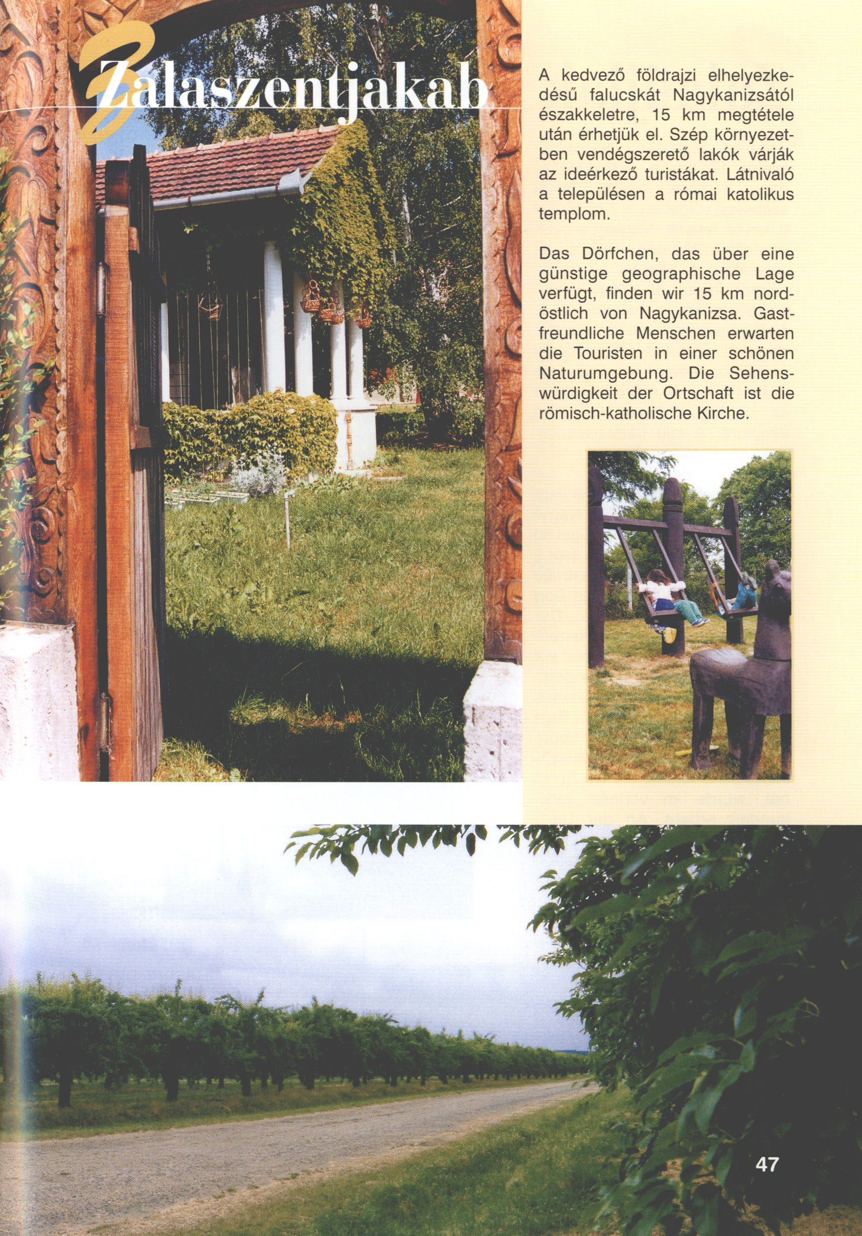 Nyilvános 2013 | 6544 | Zalaszentjakab | Das Dörfchen, das über eine günstige geographische Lage verfügt, finden wir 15 km nordöstlich von Nagykanizsa. Gastfreundliche Menschen erwarten die Touristen in einer schönen Naturumgebung. Die Sehenswürdigkeit der Ortschaft ist die römisch-katholische Kirche. Dieses Text stammt von: Titel: Hívogató a Régiók Kapujában - Útikönyv Látnivalók Nagykanizsán és Térségében (Einladend in dem Tor des Gebiets - Reisebuch - Sehenswürdigkeiten in Nagykanizsa und Umgebung) Herausgegeben von: Nagykanizsa és a Környező Települések Területfejlesztési Társulása (Verein für Gebietsentwicklung in Nagykanizsa und in ihrer Umgebung) 8800 Nagykanizsa, Petőfi Sándor út 5. Tel.: 06 93/536-453 • 06 93/536-454 Tel ./Fax: 06 93/326-323 E-mail: terstars@axelero.hu www.kanizsaterseg.celodin.hu |