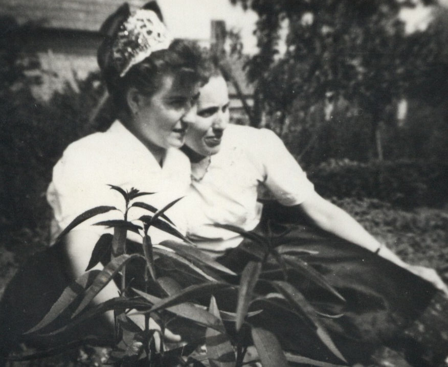 Balatonmagyaródi gyöngyös necc viselet. Fotó Kovács Ferencné gyűjteményéből. A képen a fotó tulajdonosa (főkötőben) Kovács Ferencné és Biczó Lajosné balatonmagyaródi lakosok láthatók.