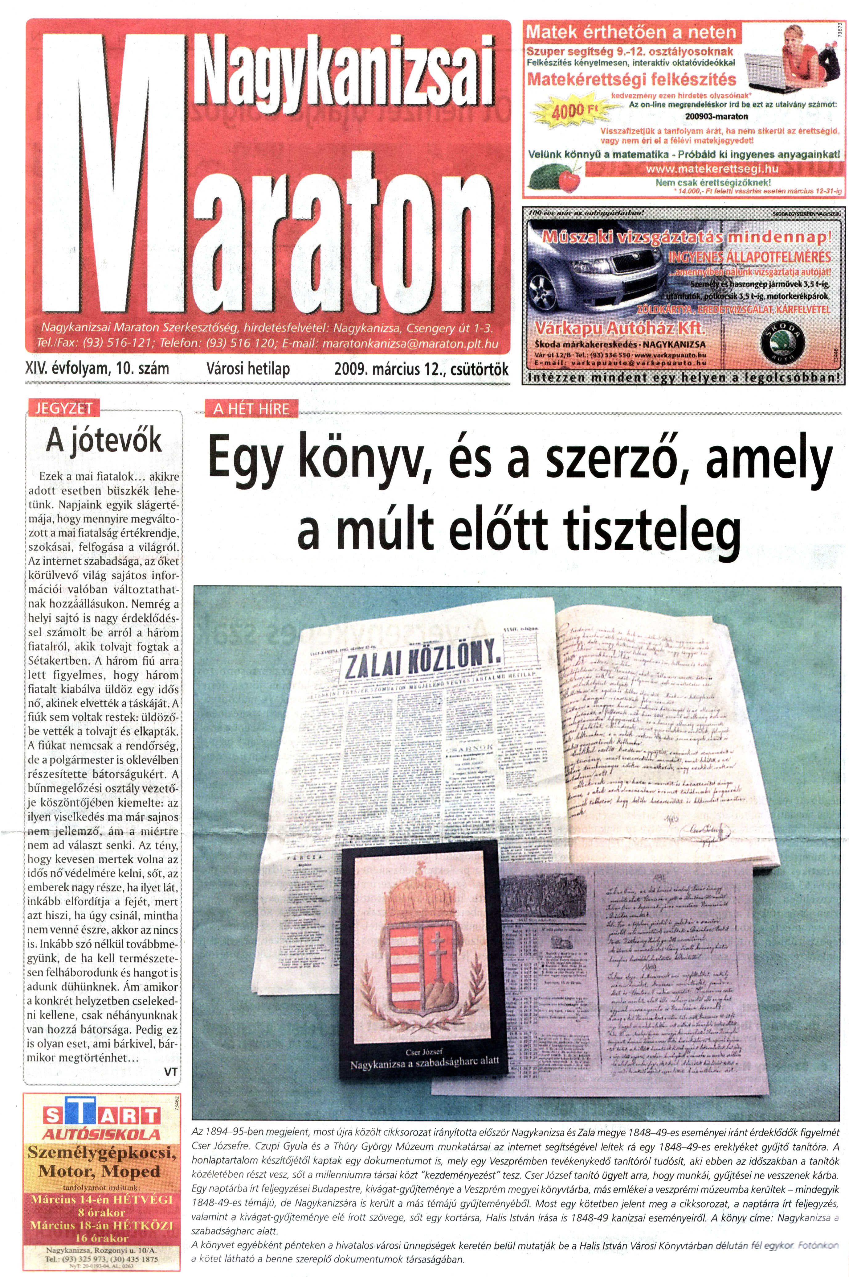 Nyilvános 1271 | 2377 | Nagykanizsai Maraton 2009. március 12. 10. szám 1. oldal | Egy könyv, és a szerző, amely a múlt előtt tiszteleg A cikk szövege: Egy könyv, és a szerző, amely a múlt előtt tiszteleg Az 1894–95-ben megjelent, most újra közölt cikksorozat irányította először Nagykanizsa és Zala megye 1848–49-es eseményei iránt érdeklődők figyelmét Cser Józsefre. Czupi Gyula és a Thúry György Múzeum munkatársai az internet segítségével leltek rá egy 1848–49-es ereklyéket gyűjtő tanítóra. A honlaptartalom készítőjétől kaptak egy dokumentumot is, mely egy Veszprémben tevékenykedő tanítóról tudósít, aki ebben az időszakban a tanítók közéletében részt vesz, sőt a millenniumra társai közt „kezdeményezést” tesz. Cser József tanító ügyelt arra, hogy munkái, gyűjtései ne vesszenek kárba. Egy naptárba írt feljegyzései Budapestre, kivágat-gyűjteménye a Veszprém megyei könyvtárba, más emlékei a veszprémi múzeumba kerültek – mindegyik 1848–49-es témájú, de Nagykanizsára is került a más témájú gyűjteményéből. Most egy kötetben jelent meg a cikksorozat, a naptárra írt feljegyzés, valamint a kivágat-gyűjteménye elé írott szövege, sőt egy kortársa, Halis István írása is 1848–49 kanizsai eseményeiről. A könyv címe: Nagykanizsa a szabadságharc alatt. A könyvet egyébként pénteken a hivatalos városi ünnepségek keretén belül mutatják be a Halis István Városi Könyvtárban délután fél egykor. Fotónkon a kötet látható a benne szereplő dokumentumok társaságában. |