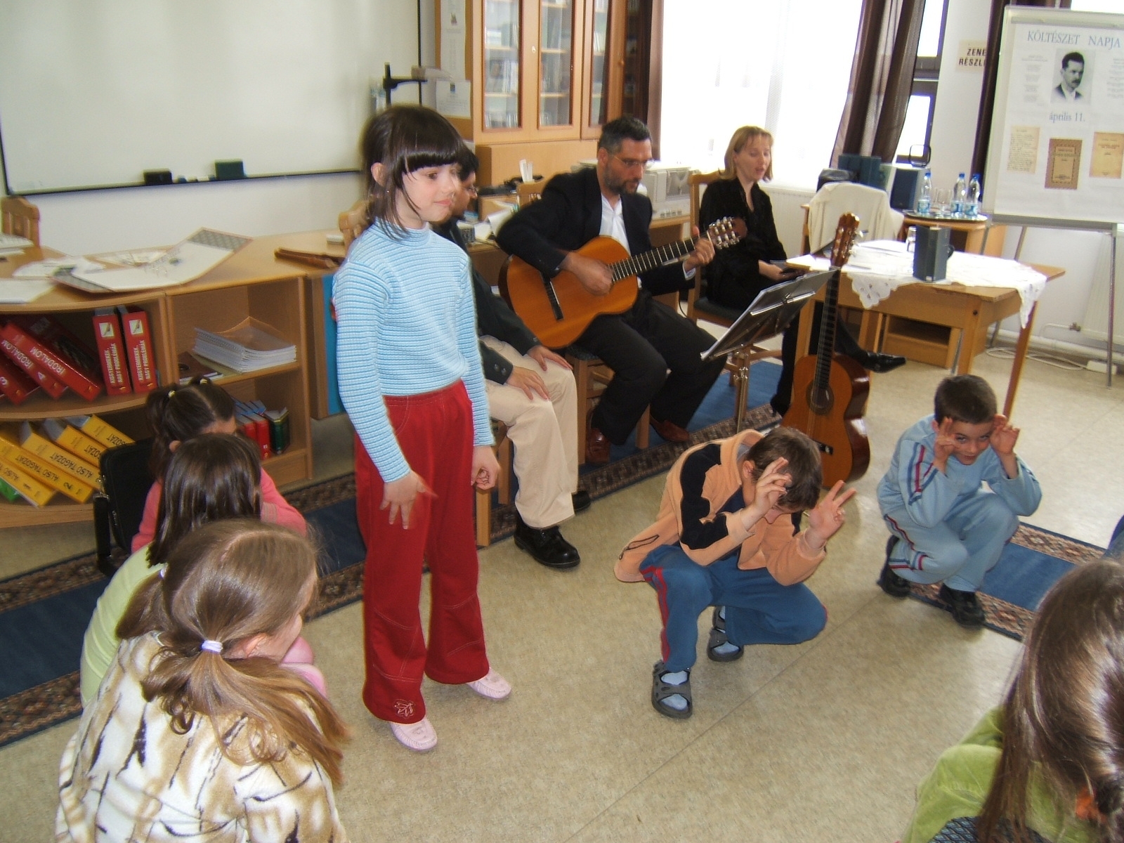 Nyilvános 1523 | 3629 | Költészet napja műsor a zalakarosi könyvtárban 2006. április 11-én. Vendégünk volt a Kardos Banda együttes, aki a kisiskolásoknak és a nagyoknak külön összeálított \"Költészet - minden formában régiektől, maiaktól\" című műsorát adta elő. | |