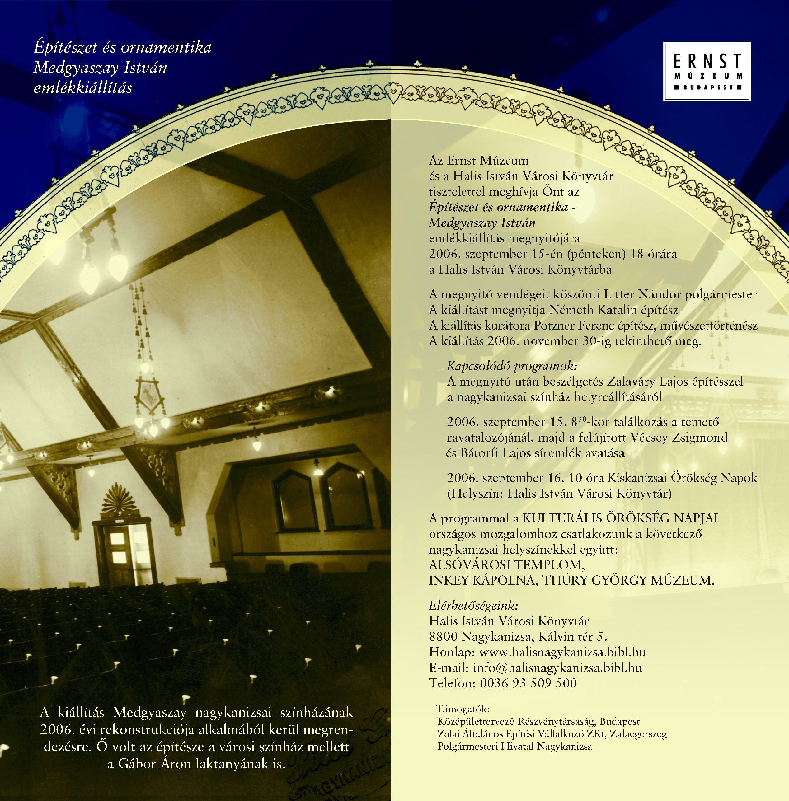 Nyilvános 2547 | 6972 | 2006 09 15 - Építészet és ornamentika - Medgyaszay István emlékkiállítás meghívó | A kiállítás megnyitója az eseménynaptárban is szerepel, a következő link alatt: http://www.nagykar.hu/esemenynaptar/1/488.html A program a Kultúrális Örökség Napjai programsorozat része. Kapcsolódó programok: Helytörténeti konferencia http://www.nagykar.hu/esemenynaptar/1/483.html a felújított Vécsey Zsigmond és Bátorfi Lajos síremlékek avatása http://www.nagykar.hu/esemenynaptar/1/489.html Az meghívó szövege: Építészet és ornamentika - Medgyaszay István emlékkiállítás A kiállítás Medgyaszay nagykanizsai színházának 2006. évi rekonstrukciója alkalmából kerül megrendezésre. Ő volt az építésze a városi színház mellett a Gábor Áron laktanyának is. Az Ernst Múzeum és a Halis István Városi Könyvtár tisztelettel meghívja Önt az Építészet és ornamentika- Medgyaszay István emlékkiállítás megnyitójára 2006. szeptember 15-én (pénteken) 18 órára a Halis István Városi Könyvtárba A megnyitó vendégeit köszönti Litter Nándor polgármester A kiállítást megnyitja Németh Katalin építész A kiállítás kurátora Potzner Ferenc építész, művészettörténész A kiállítás 2006. november 30-ig tekinthető meg. Kapcsolódó programok: A megnyitó után beszélgetés Zalaváry Lajos építésszel a nagykanizsai színház helyreállításáról 2006. szeptember 15. 830-kor találkozás a temető ravatalozójánál, majd a felújított Vécsey Zsigmond és Bátorfi Lajos síremlék avatása 2006. szeptember 16. 10 óra Kiskanizsai Örökség Napok (Helyszín: Halis István Városi Könyvtár) A programmal a KULTURÁLIS ÖRÖKSÉG NAPJAI országos mozgalomhoz csatlakozunk a következő nagykanizsai helyszínekkel együtt: ALSÓVÁROSI TEMPLOM, INKEY KÁPOLNA, THÚRY GYÖRGY MÚZEUM. Elérhetőségeink: Halis István Városi Könyvtár 8800 Nagykanizsa, Kálvin tér 5. Honlap: www.halisnagykanizsa.bibl.hu E-mail: info@halisnagykanizsa.bibl.hu Telefon: 0036 93 509 500 Támogatók: Középülettervező Részvénytársaság, Budapest Zalai Általános Építési Vállalkozó ZRt, Zalaegerszeg Polgármesteri Hivatal Nagykanizsa |