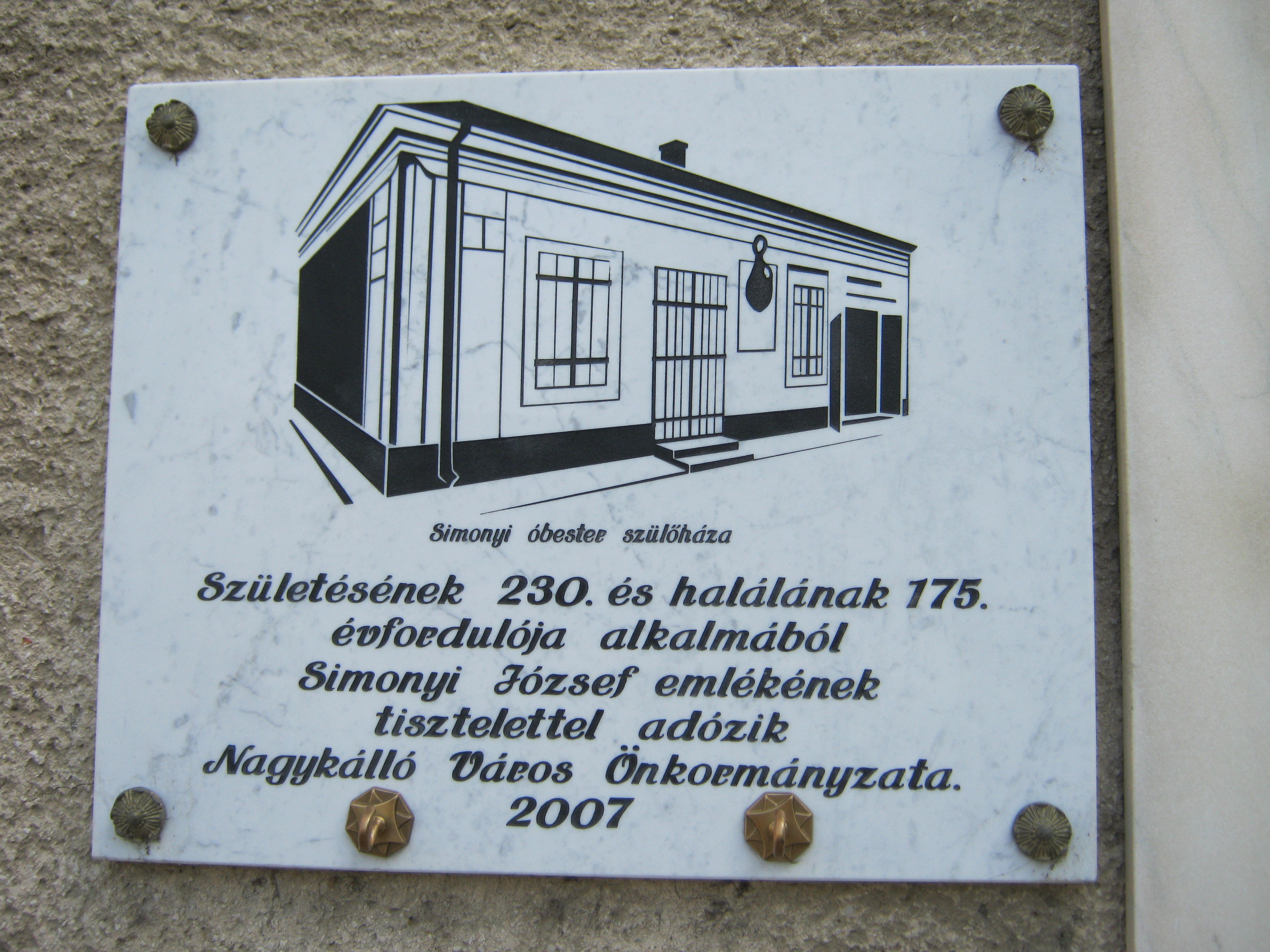 Nyilvános 1465 | 3115 | Nagykálló, Bátori út 2. | Egykor ezen a helyen állott a legendás Simonyi óbester szülőháza. Barbácsi és vitézvári báró Simonyi József (1771. március 18. – 1832. augusztus 23.), legendás hírű huszártiszt volt, kortársai "a legvitézebb huszár" kitüntető címmel illették. A panelházon szerencsére legalább látható az eredeti épületen 1932-ben elhelyezett emléktábla, egy új márványtáblán pedig megörökítették a szülőház képét. A fénykép 2010 augusztus elején készült. |