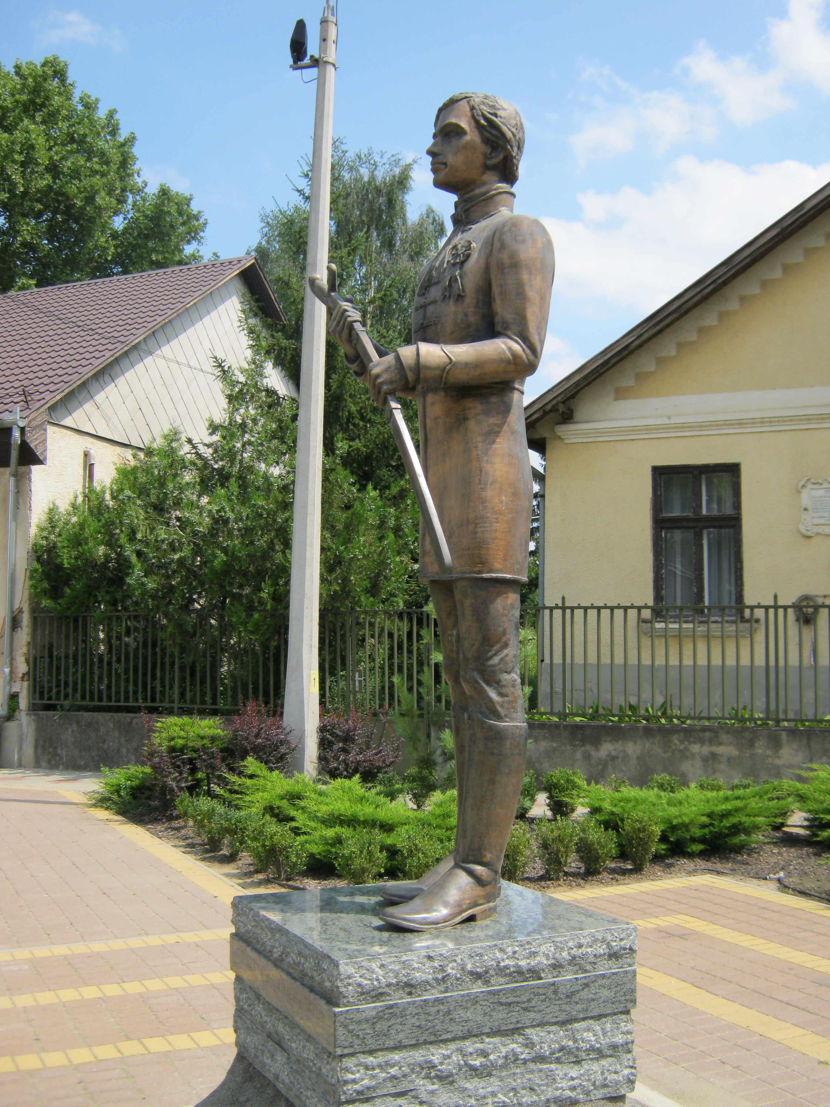 Nyilvános 1056 | 1625 | Nagykálló, Szabadság tér 6. előtt: Márciusi Ifjú szobra | Korányi Frigyes szülőháza előtt állították fel 2006-ban Nagy Lajos Imre: Márciusi ifjú című egészalakos szobrát annak emlékére, hogy 1848. szeptember 11-én 1200 ifjú önkéntes tett esküt Nagykálló főterén. A szobor Korányi szülőháza előtt állva emlékeztet arra is, hogy Korányi Frigyes maga is részt vett a szabadságharcban. Felh. irod.: Harsányi Gézáné: Kálló kincsei. Nagykálló, 2007 A fénykép 2010 augusztus elején készült |