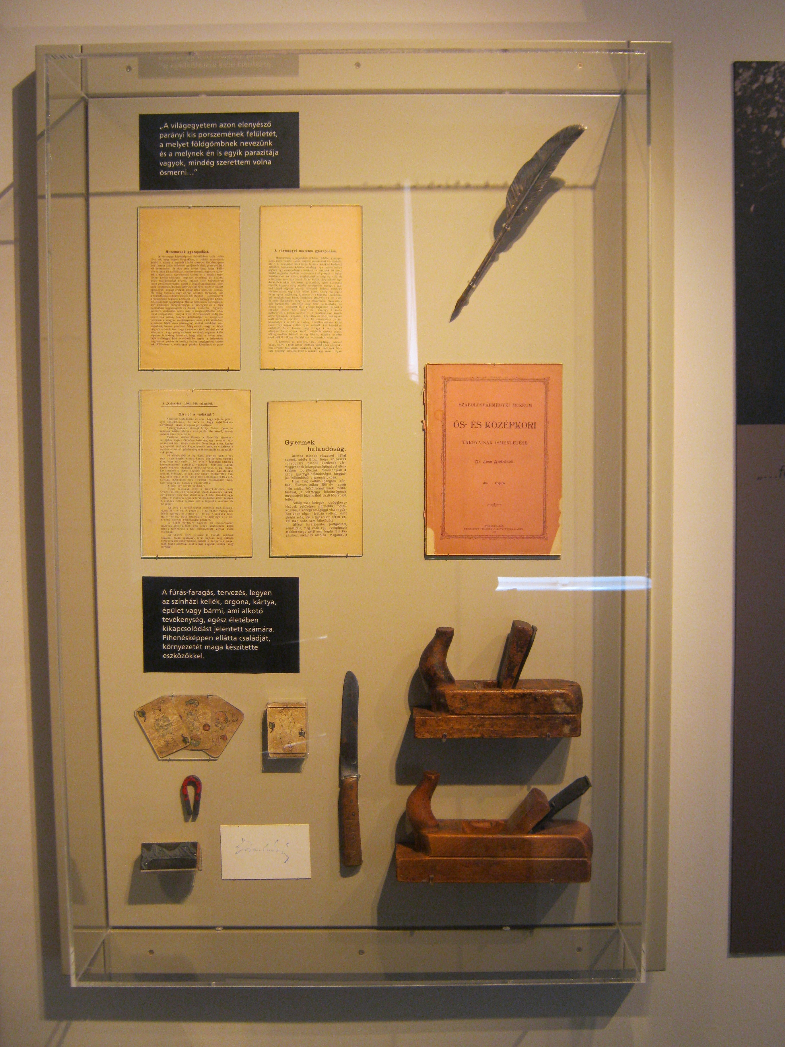 Nyilvános 1104 | 1573 | Nyíregyháza, Benczúr tér 21. Jósa András Múzeum | Magyarország egyik legrégibb múzeumát Dr. Jósa András alapította 1868-ban, akinek ma nevét viseli. Jósa András (1834-1918) Szabolcs vármegye legendás orvosa volt. Színes, sokoldalú egyéniségként amatőr régészettel is foglalkozott. A múzeum elődét még korábbi lakóhelyén, Nagykállón (lásd: Nagykálló, Somogyi B. u. 5-7.) szervezte meg Szabolcs Megyei Régészeti Egylet néven, ugyanis akkor még Nagykálló volt a megyeszékhely. Nyíregyháza megyei központtá válása után a gyűjtemény és ő maga is ide költözött (lásd még: Nyíregyháza, Malom u. 3.). Az első kiállítást is ő rendezte 1899-ben, akkor még a vármegyeháza (lásd:Nyíregyháza, Hősök tere 5.) épületében. A képen a Jósa-emlékkiállítás egyik tárlója látható, benne az orvos-muzeológus famegmunkáló szerszámaival. Felh. irod.: Látnivalók Szabolcs-Szatmár-Bereg megyében. Miskolc, Well-PRess, 1999 http://jam.nyirbone.hu A fénykép 2010 augusztus elején készült. |