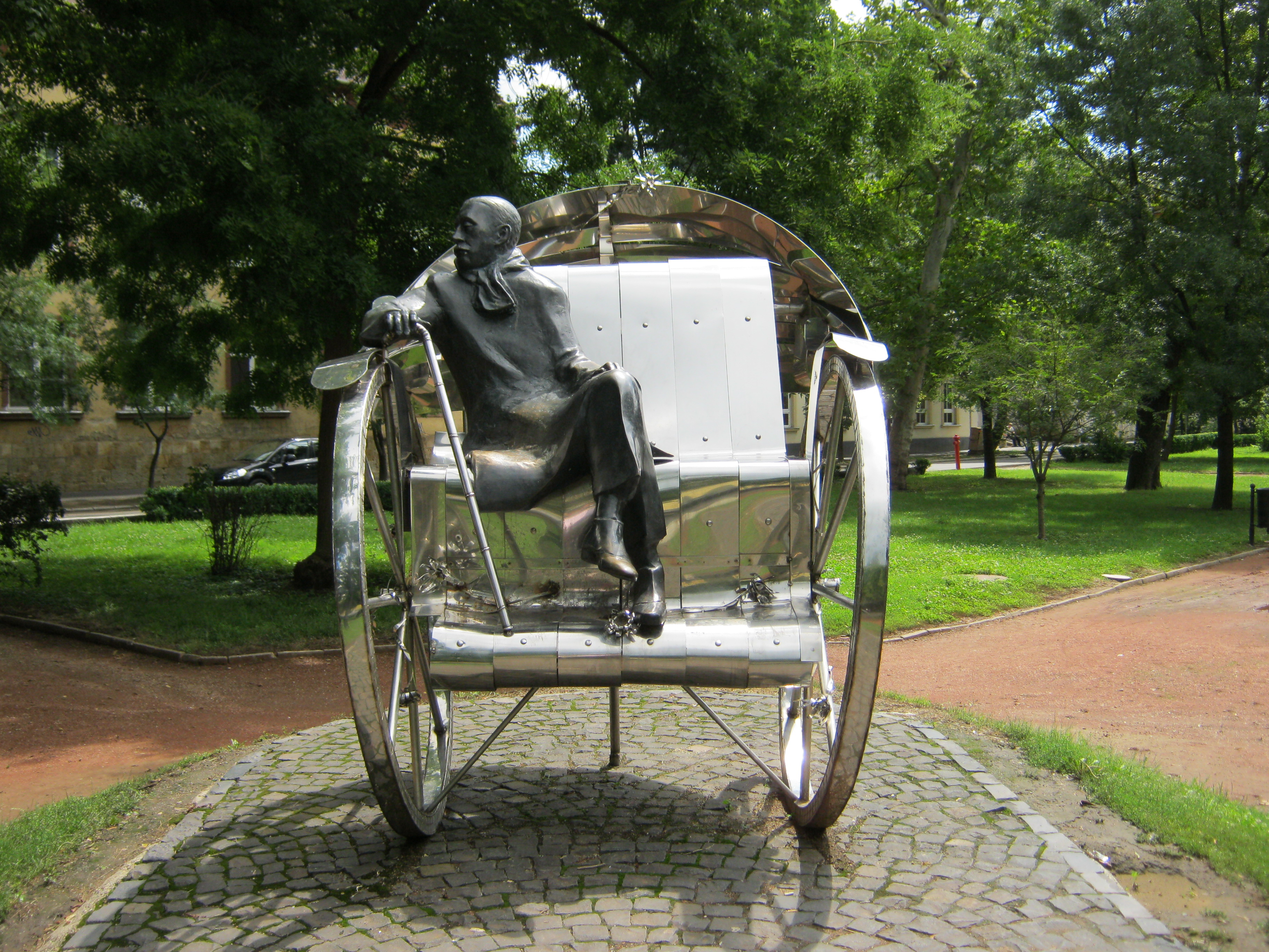 Nyilvános 1101 | 3264 | Nyíregyháza, Bessenyei tér: Krúdy Gyula szobra | A Bessenyei téren 2003-ban avatták fel Varga Imre "Hazatérés" című, Krúdy Gyulának emléket állító szoborkompozícióját. Az alkotást Krúdy: A vörös postakocsi című regénye ihlette. Krúdy Nyíregyházán született (lásd: Nyíregyháza, Szent István utca 8.) és itt végezte a gimnázium (lásd: Nyíregyháza, Szent István u. 17-19.) felsőbb osztályait. A fénykép 2010 augusztus elején készült. |
