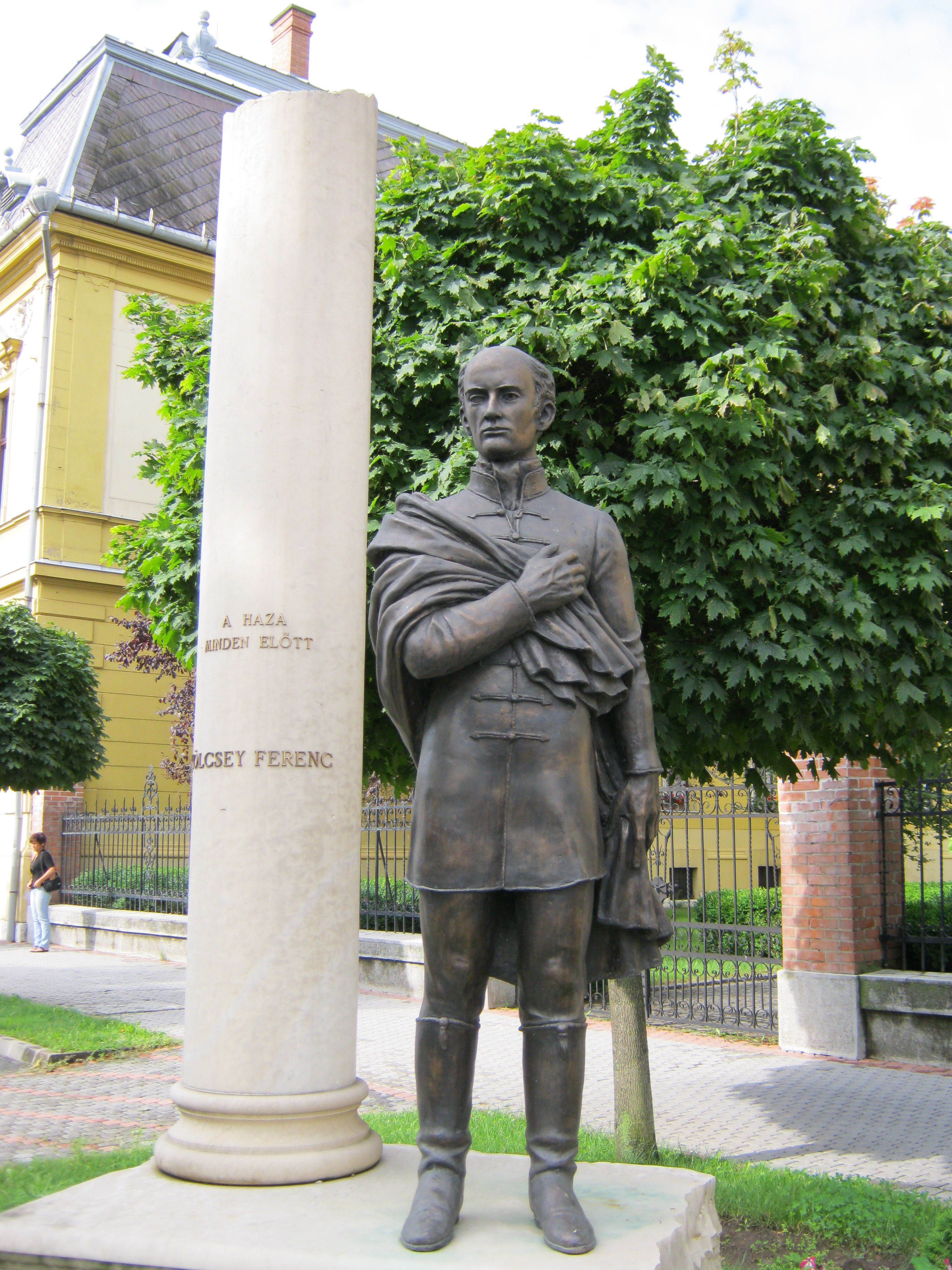 Nyilvános 1108 | 1530 | Nyíregyháza, Hősök tere 5. Megyeháza | Az eklektikus stílusú megyeháza 1891-1892-ben, Alpár Ignác tervei szerint épült. Homlokzatát Szabolcs vezér és az államalapító István király szobrai díszítik. Az épületplasztikák és díszítmények Verán József munkái. Nyíregyháza 1876-ban lett megyeszékhely, korábban Nagykálló töltötte be ezt a szerepet. Az épület előtt 2008-ban állították fel Bíró Lajos Kölcsey Ferencet megjelenítő szoborkompozícióját. A költőt szívre tett kézzel ábrázoló köztéri alkotást a Himnusz születésének 185. és Kölcsey halálának 170. évfordulójára emlékezve emelték. Az oszlop felirata: A haza minden előtt. Kölcsey Szatmár vármegye főjegyzője és országgyűlési követe volt. Szabadelvű politikusként a nemzeti függetlenségért, a polgári és emberi jogokért, a jobbágyfelszabadításért, a nemzeti egységért, a vallási egyenjogúságért és türelemért, a magyar nyelv hivatalossá tételéért dolgozott. Tiltakozásul a vármegye felszólítására, hogy az örökváltság ellen szavazzon, képes volt lemondani politikai karrierjéről. Felh. irod.: Látnivalók Szabolcs-Szatmár-Bereg megyében. Miskolc, Well-PRess, 1999 www.szoborlap.hu A fénykép 2010 augusztus elején készült. |