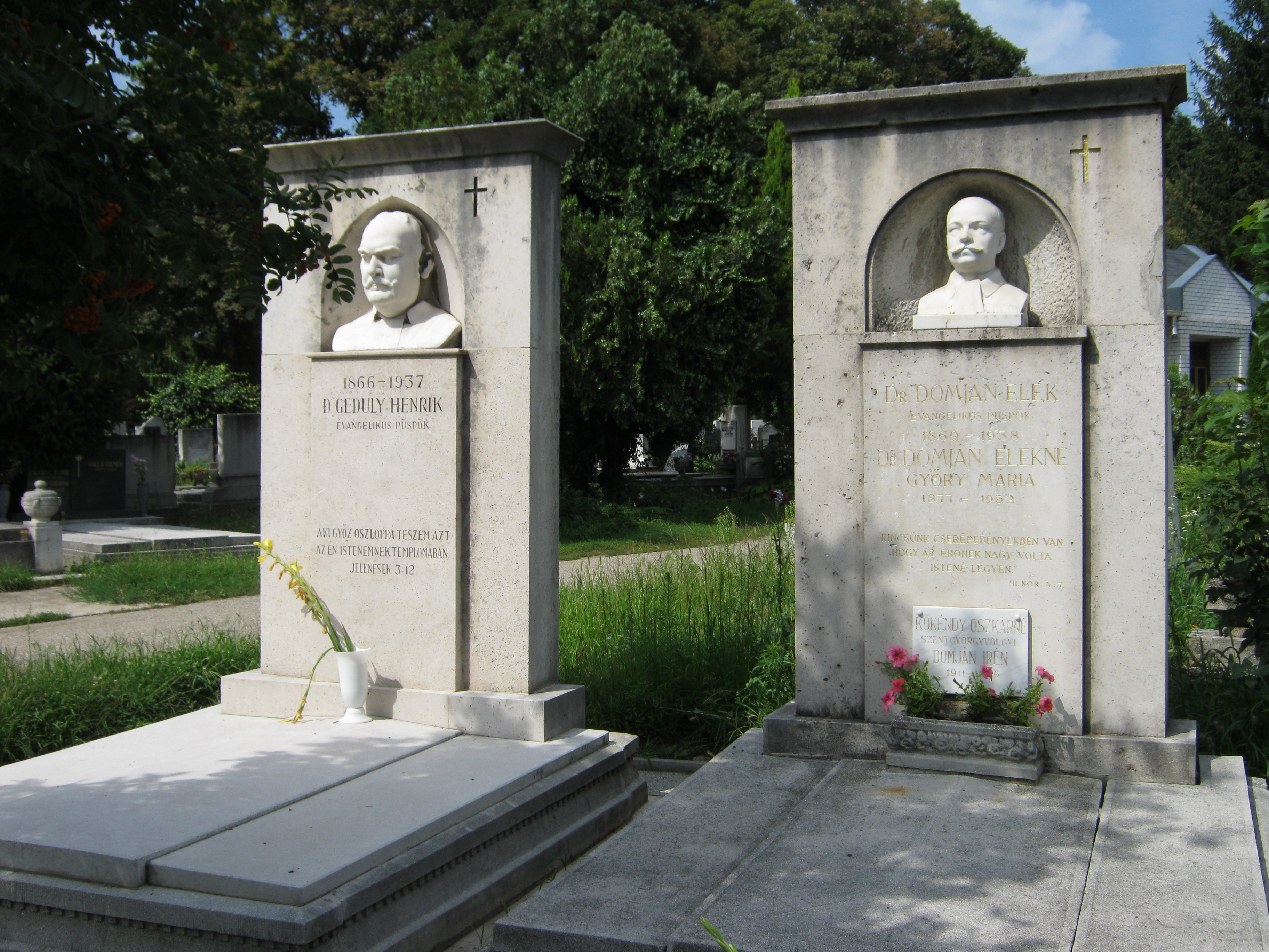Nyilvános 1135 | 3119 | Nyíregyháza, Pazonyi tér, Északi temető: Geduly Henrik és Domján Elek | A Dózsa György út vezet Nyíregyháza Északi temetőjébe. A ravatalozó mögötti díszsírhelyen nyugszik Nyíregyháza két kiváló személyisége, evangélikus püspöke, dr. Geduly Henrik (1866-1937) és dr. Domján Elek (1869-1928). Felh. irod.: Fazekas Árpád - Szekrényes András: Nyíregyháza temetői. Nyíregyháza, 1990 A fénykép 2010 augusztus elején készült |